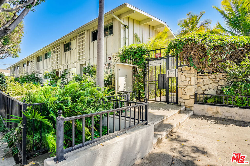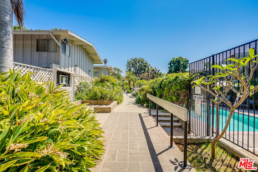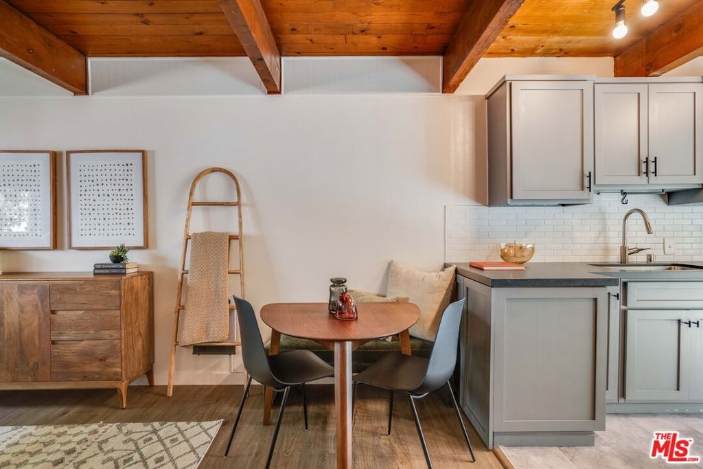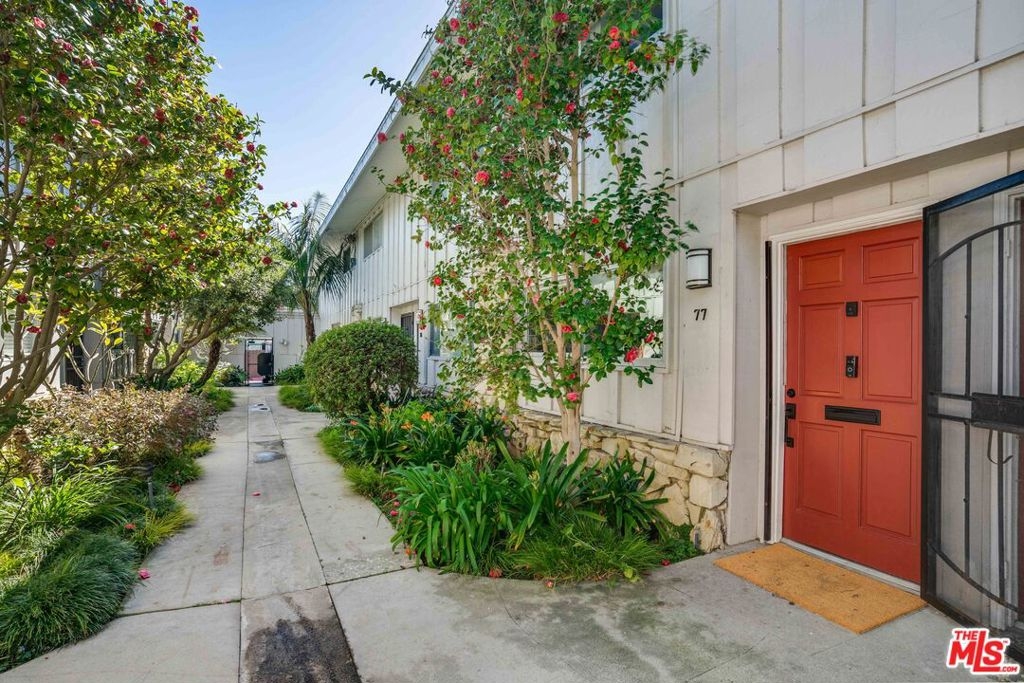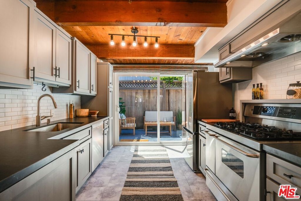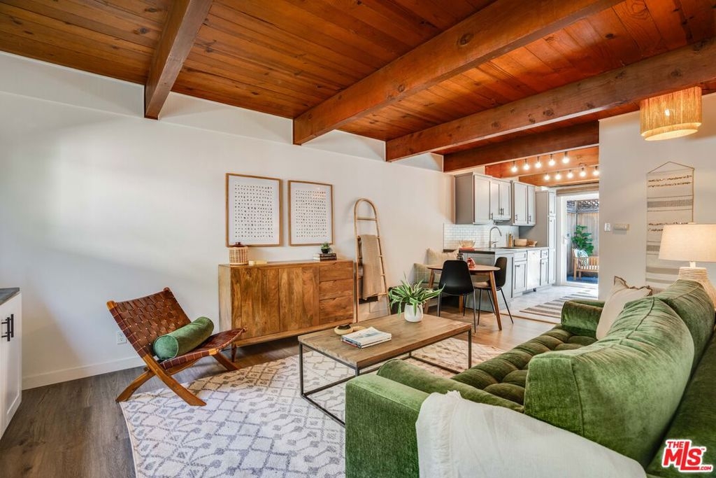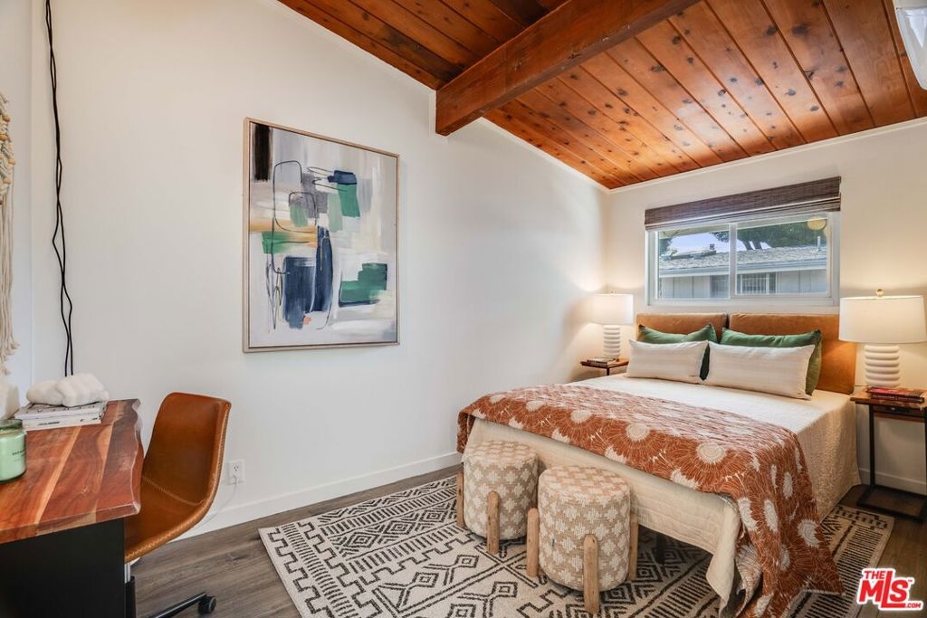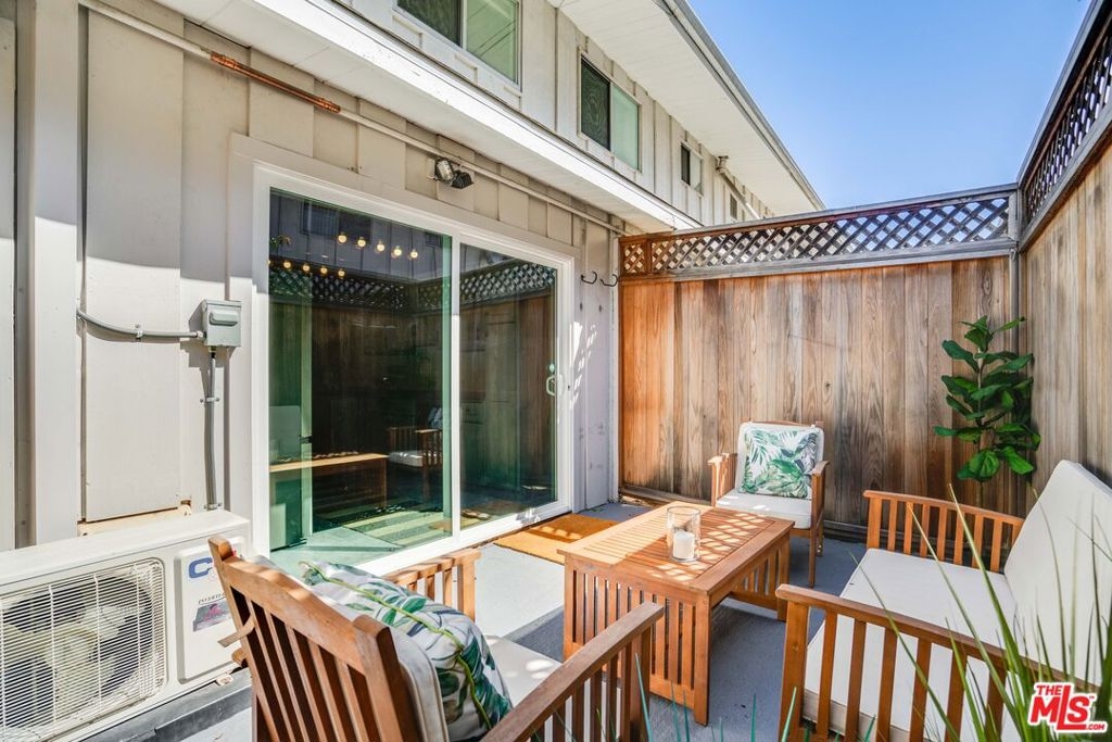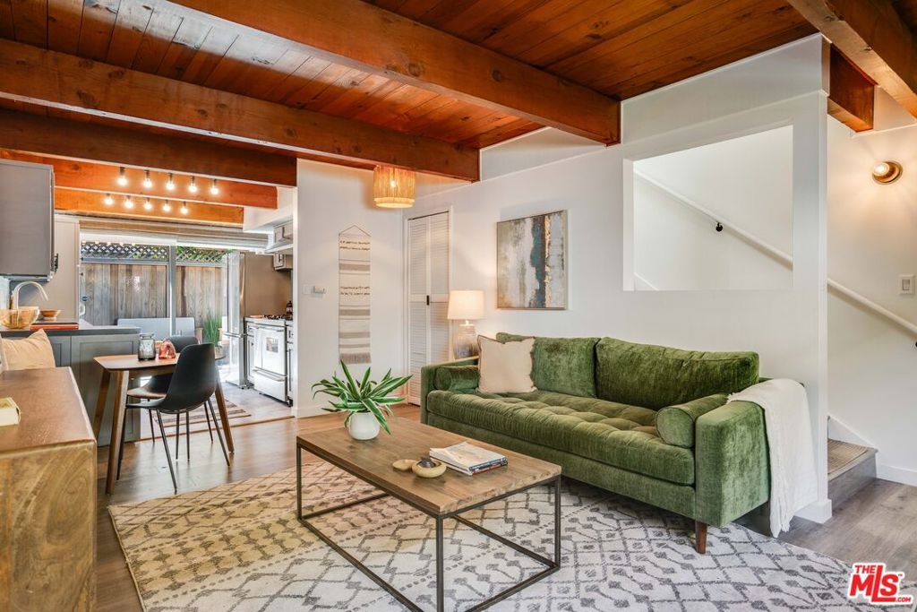 Welcome to this clean, remodeled, and gated townhouse in central Mar Vista. Step inside and you'll immediately notice the beautiful wood beamed ceilings and laminate flooring throughout, drawing you to the open concept Living/Kitchen/Patio. Updated kitchen with quartz countertops, updated lighting, and newer appliances (refrigerator, washer/dryer, dishwasher). Large open patio - perfect for relaxing, gardening, and al-fresco dining. There is a stylish half bath, storage shelves, and a stacked laundry area just off the kitchen. Upstairs there are two bedrooms and a full bath. Both bedrooms feature dramatic vaulted wood-lined ceilings with ample closet space in each room. All new within the last 5 years: Vinyl patio sliding door, AC mini split upstairs, Hunter Douglas roller shades, and updated sinks/toilets/vanities in both bathrooms. The lush gated grounds include a sparkling clean community pool and spa. This unit has its own parking spot located not too far from the unit. New roof and skylight in 2019. Close to the beach, shops, eateries, and everything else the Westside has to offer.