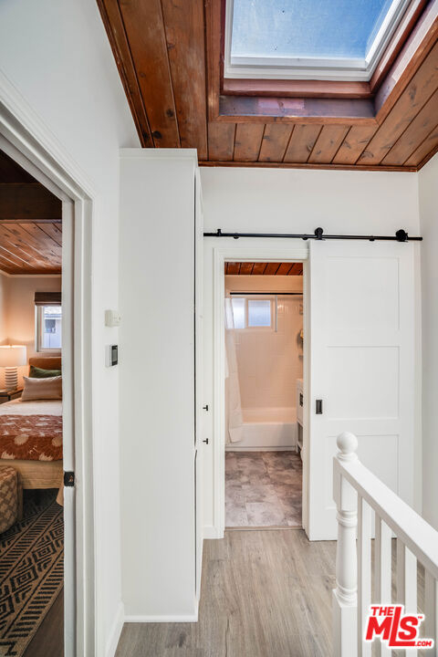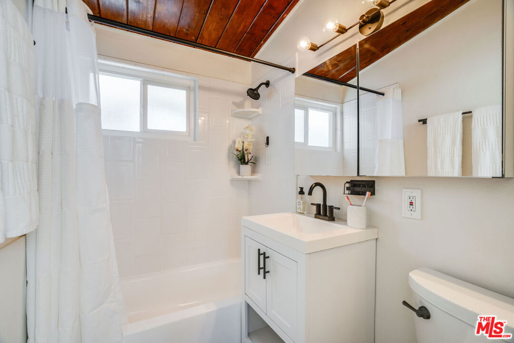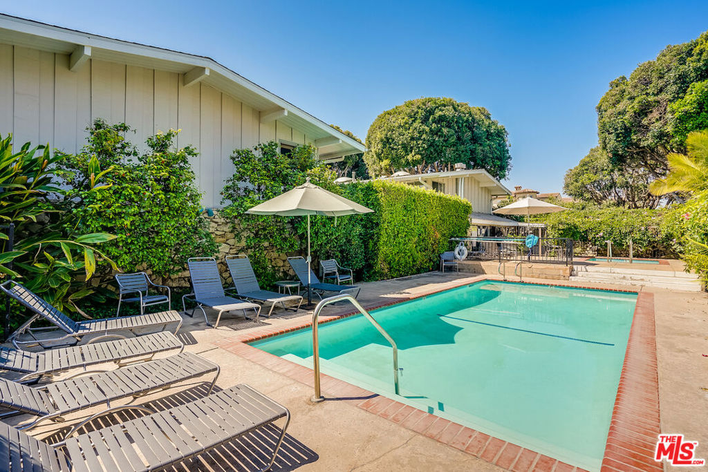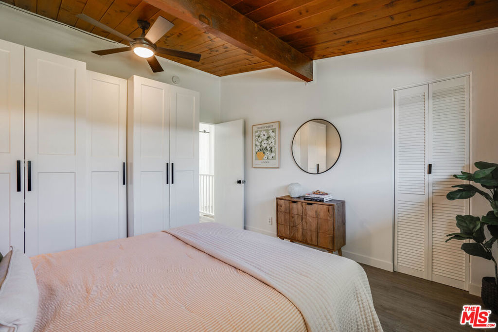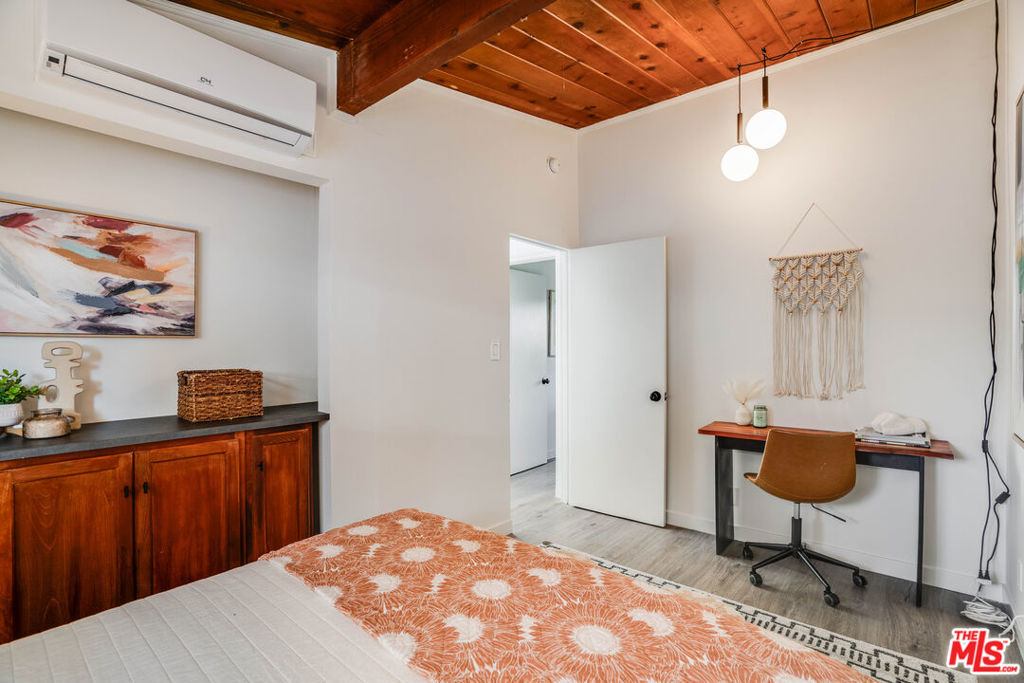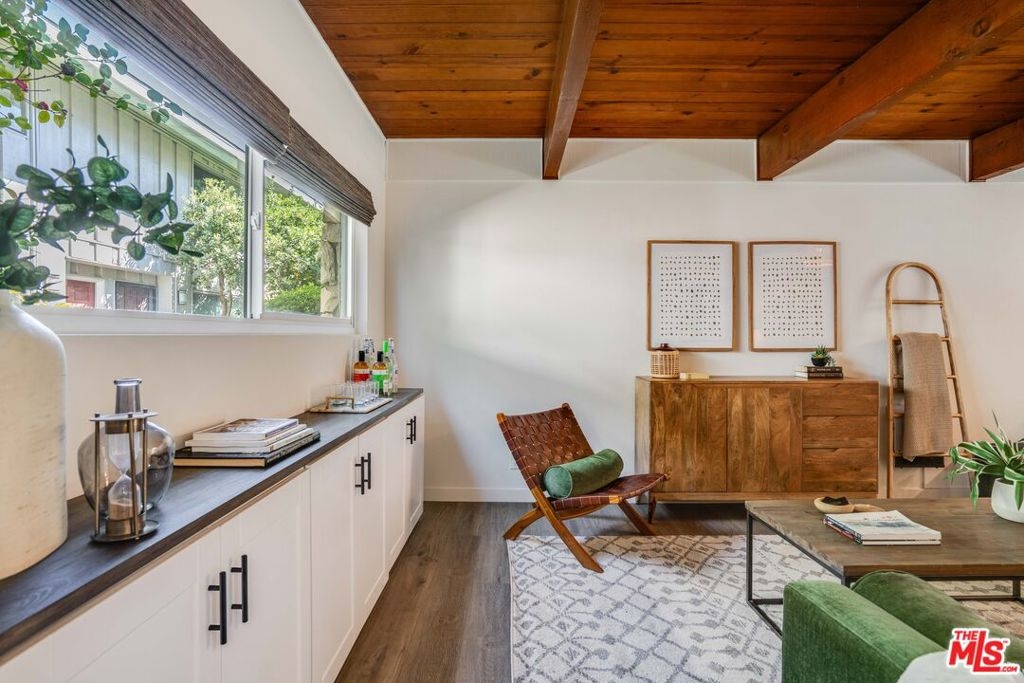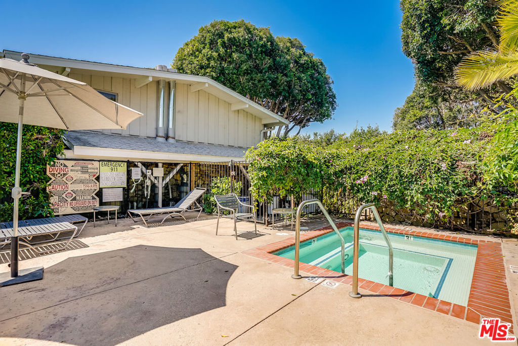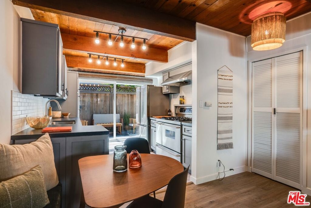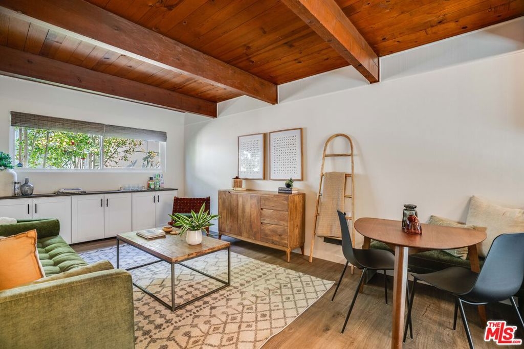 Welcome to this clean, remodeled, and gated townhouse in central Mar Vista. Step inside and you'll immediately notice the beautiful wood beamed ceilings and laminate flooring throughout, drawing you to the open concept Living/Kitchen/Patio. Updated kitchen with quartz countertops, updated lighting, and newer appliances (refrigerator, washer/dryer, dishwasher). Large open patio - perfect for relaxing, gardening, and al-fresco dining. There is a stylish half bath, storage shelves, and a stacked laundry area just off the kitchen. Upstairs there are two bedrooms and a full bath. Both bedrooms feature dramatic vaulted wood-lined ceilings with ample closet space in each room. All new within the last 5 years: Vinyl patio sliding door, AC mini split upstairs, Hunter Douglas roller shades, and updated sinks/toilets/vanities in both bathrooms. The lush gated grounds include a sparkling clean community pool and spa. This unit has its own parking spot located not too far from the unit. New roof and skylight in 2019. Close to the beach, shops, eateries, and everything else the Westside has to offer.