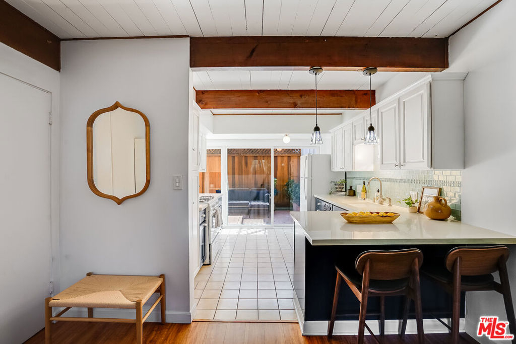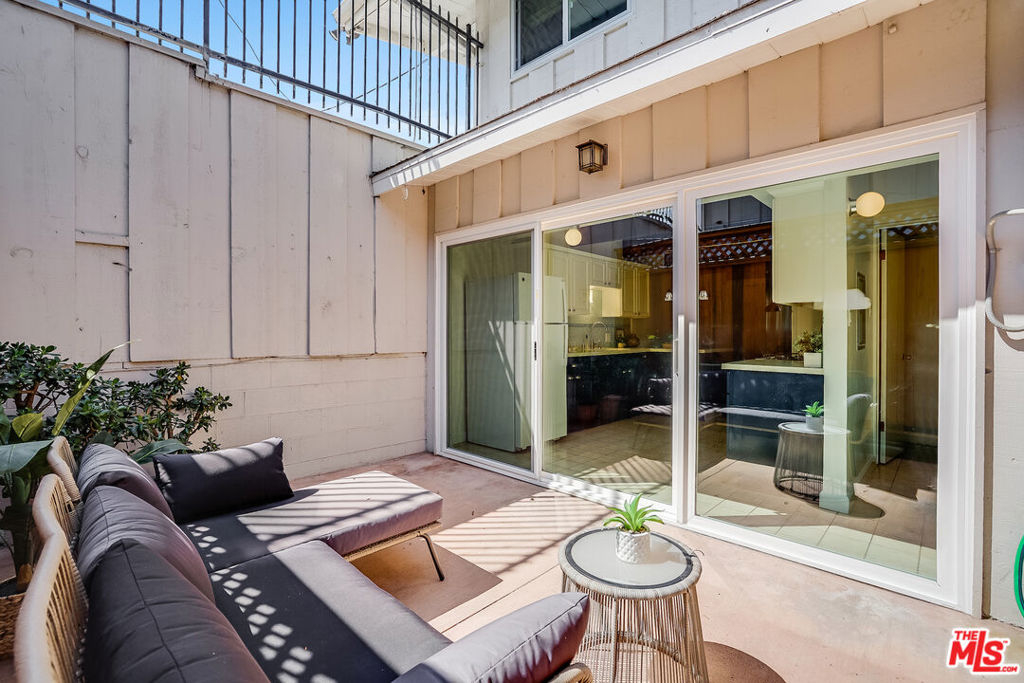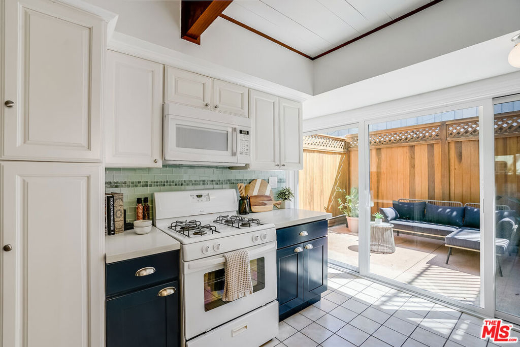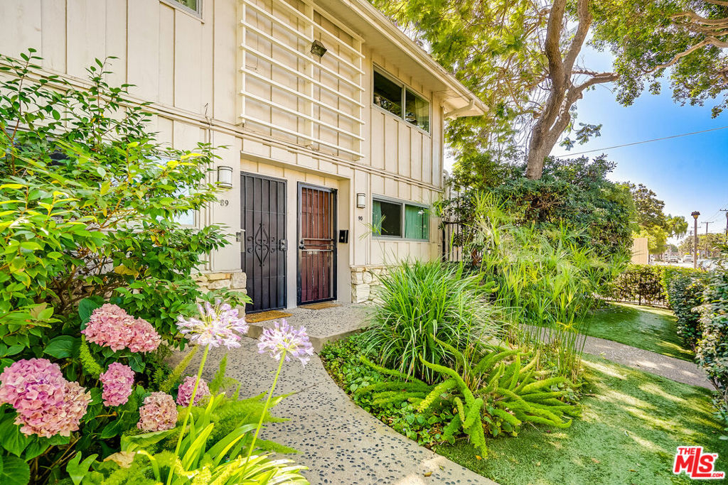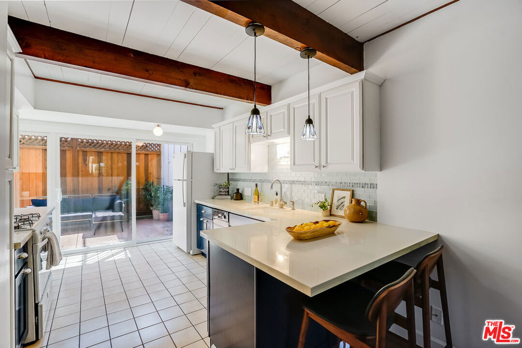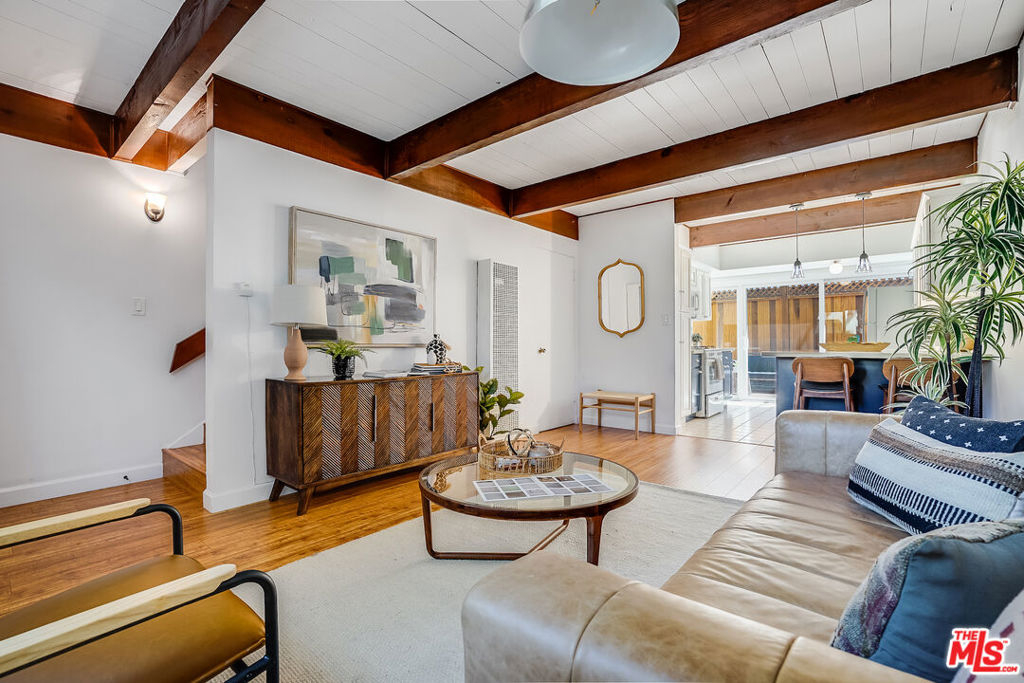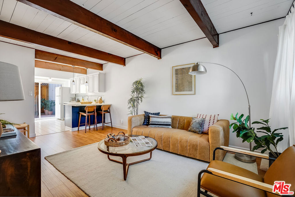 Welcome to this warm and bright front-facing corner townhouse in central Mar Vista. Step inside and you'll immediately notice the beautiful wood beamed ceilings drawing you to the open concept Living/Kitchen/Patio. Updated kitchen with quartz countertops, soft-close drawers, and glass-tile backsplash. Large open patio - perfect for relaxing, gardening, and al-fresco dining. There is a half bath and side-by-side laundry area just off the kitchen. Upstairs there are two bedrooms and a full bath. Both bedrooms feature dramatic vaulted wood-lined ceilings with ample closet space in each room. New vinyl windows/slider in 2023, plus new electric sub panel and laundry in 2021. The lush gated grounds include a sparkling clean community pool and spa. This unit has direct-street access, and its own parking spot located directly next to the unit - just inside the gated grounds. Close to the beach, shops, eateries, and everything else the Westside has to offer.