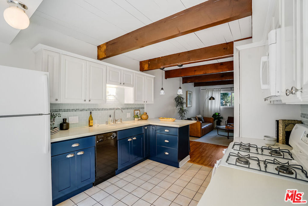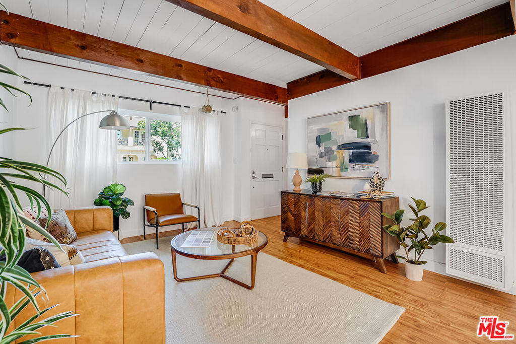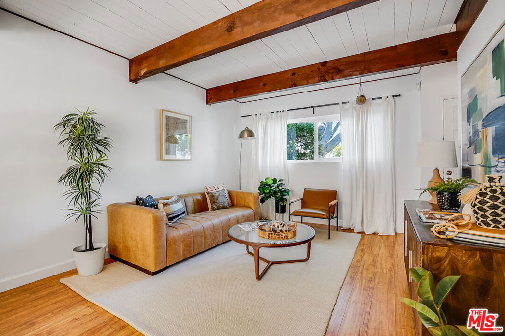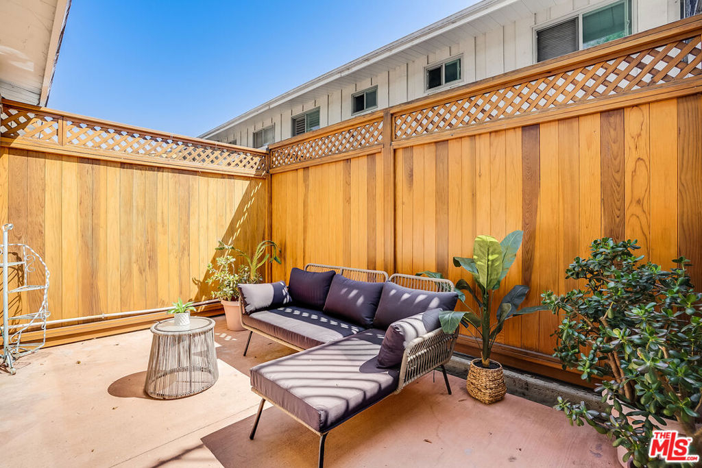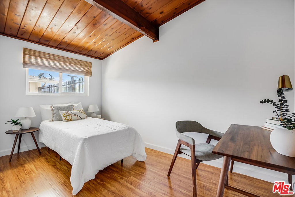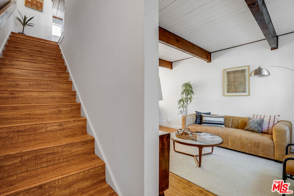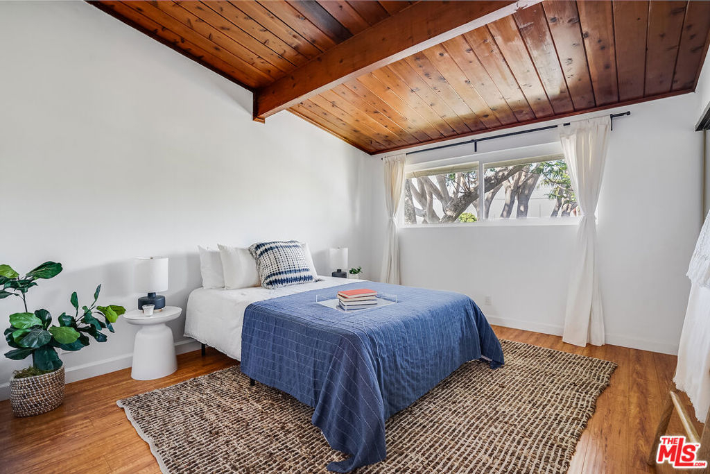 Welcome to this warm and bright front-facing corner townhouse in central Mar Vista. Step inside and you'll immediately notice the beautiful wood beamed ceilings drawing you to the open concept Living/Kitchen/Patio. Updated kitchen with quartz countertops, soft-close drawers, and glass-tile backsplash. Large open patio - perfect for relaxing, gardening, and al-fresco dining. There is a half bath and side-by-side laundry area just off the kitchen. Upstairs there are two bedrooms and a full bath. Both bedrooms feature dramatic vaulted wood-lined ceilings with ample closet space in each room. New vinyl windows/slider in 2023, plus new electric sub panel and laundry in 2021. The lush gated grounds include a sparkling clean community pool and spa. This unit has direct-street access, and its own parking spot located directly next to the unit - just inside the gated grounds. Close to the beach, shops, eateries, and everything else the Westside has to offer.