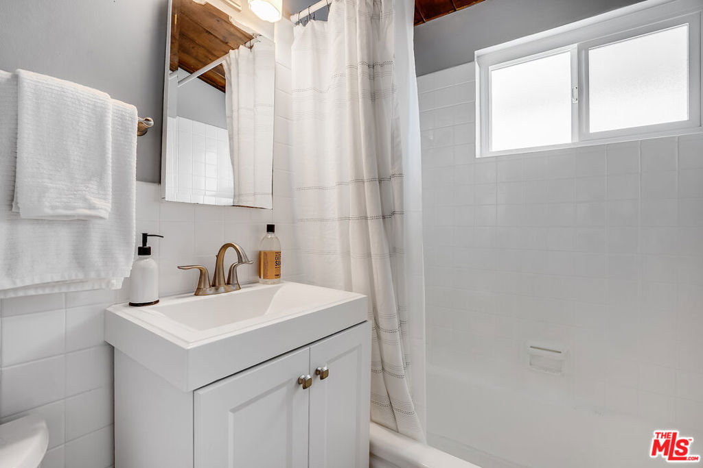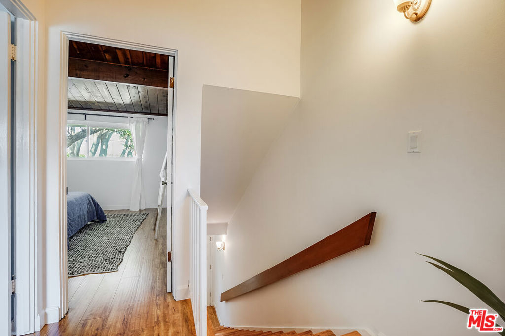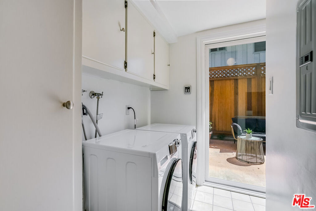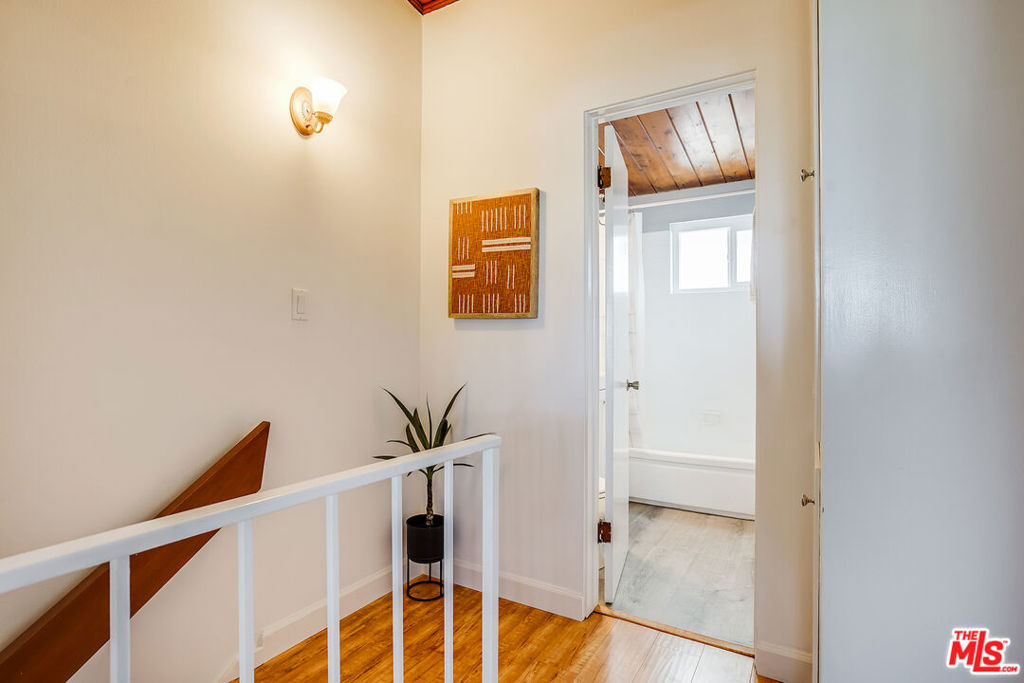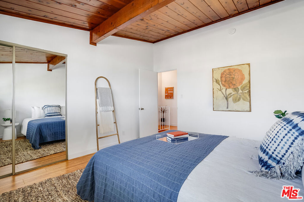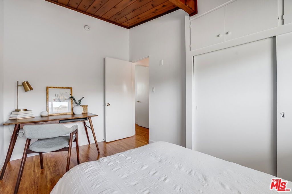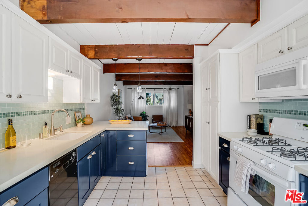 Welcome to this warm and bright front-facing corner townhouse in central Mar Vista. Step inside and you'll immediately notice the beautiful wood beamed ceilings drawing you to the open concept Living/Kitchen/Patio. Updated kitchen with quartz countertops, soft-close drawers, and glass-tile backsplash. Large open patio - perfect for relaxing, gardening, and al-fresco dining. There is a half bath and side-by-side laundry area just off the kitchen. Upstairs there are two bedrooms and a full bath. Both bedrooms feature dramatic vaulted wood-lined ceilings with ample closet space in each room. New vinyl windows/slider in 2023, plus new electric sub panel and laundry in 2021. The lush gated grounds include a sparkling clean community pool and spa. This unit has direct-street access, and its own parking spot located directly next to the unit - just inside the gated grounds. Close to the beach, shops, eateries, and everything else the Westside has to offer.