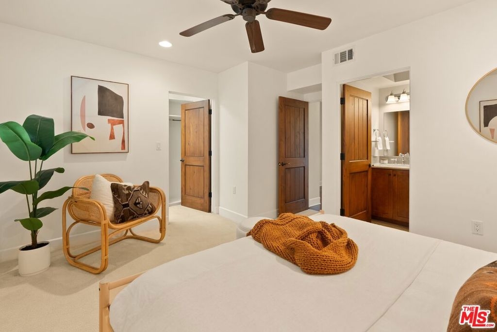 Set on a peaceful, tree-lined street in the heart of Mar Vista, this beautifully appointed townhome combines thoughtful design with everyday comfort. Offering 2 bedrooms, 2 bathrooms, and a spacious loft, this light-filled residence exudes warmth and versatility. The main living space features dramatic ceilings, rich hardwood floors, and a fireplace that anchors the room with charm and function. The kitchen is well-equipped for culinary enthusiasts, featuring a 6-burner Viking range, stainless steel appliances, a walk-in pantry, and abundant storage. Retreat to the generous primary suite with a walk-in closet and a serene en suite bathroom, complete with a soaking tub. The second bedroom includes ample closet space and access to a private balcony. The upstairs loft, perfect for a home office, gym, or creative space, also opens to its own balcony and could absolutely function as a third bedroom space if desired. Additional conveniences include a private 2-car garage equipped with 240-voltage, washer and dryer, and a large bonus storage area. A fenced front yard provides a tranquil outdoor space that's exclusively yours. Enjoy the unbeatable location just minutes from popular restaurants, coffee shops, and neighborhood favorites, all in one of the Westside's most walkable communities.