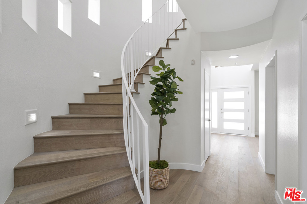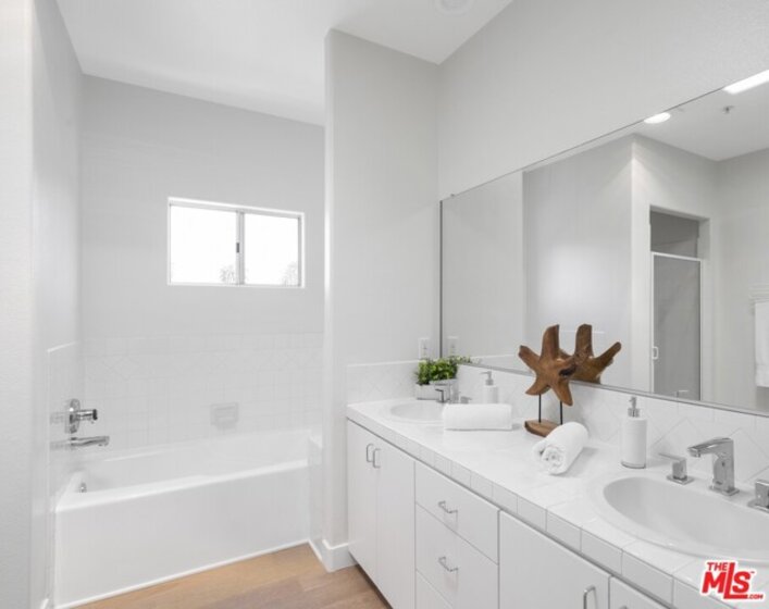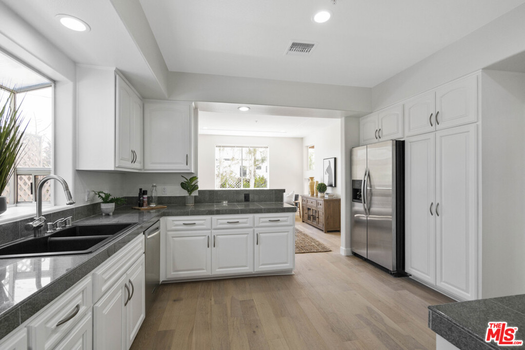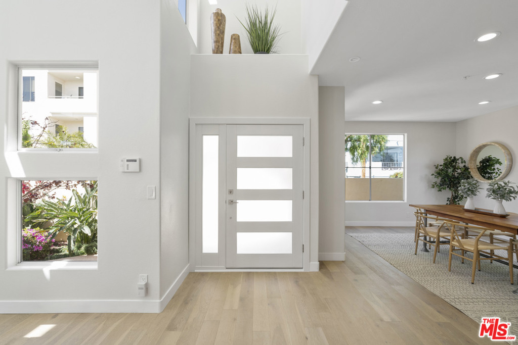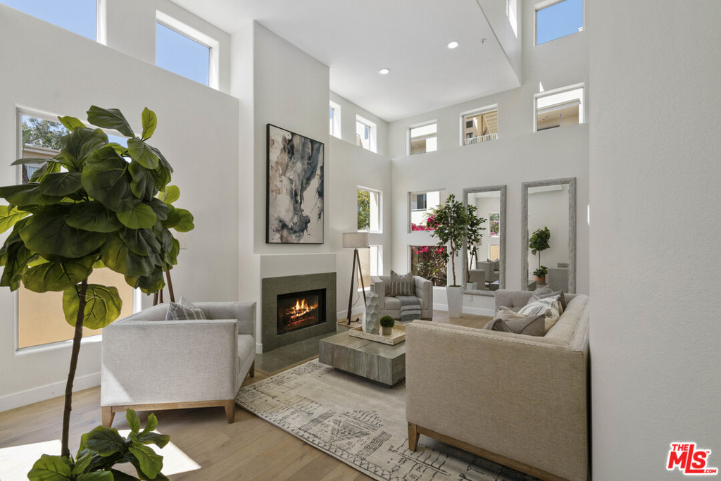 YOU REALLY MUST SEE THIS PROPERTY! Set far back from the street and hidden from the hustle & bustle of LA, this quiet & serene little paradise within the complex grounds is free standing sitting on 3,000 sqft of exclusive use land perfect for pets to roam around in a secured yard! Inviting & charming, this uniquely updated freestanding 2-story 3BR/3BA, brightly lit abode welcomes with an impressive great room featuring 19 ft ceilings, a flood of natural light through an abundance of windows, a romantic gas log fireplace, gorgeous hardwood floors and easy access to the private backyard with BBQ area. In addition to the living room, family room and dining room/den, there is a bonus area that can be used as an office/breakfast nook. The kitchen features stainless steel appliances, smooth granite countertops, ample cabinetry and a breakfast bar. The master bedroom has dual walk-in closets, an en suite with deep soaking tub, two-sink vanity & separate shower. Both 2nd-floor additional bedrooms are sizable with one bedroom featuring a walk-in closet along with an optional 4th bedroom downstairs. Located in the middle of the Mar Vista Oval, a great 1 mile walking loop lined with King Palms. Because it's set far back from the street, this home has no street or traffic noise. So peaceful that the vibe feels like a Villa at a resort.