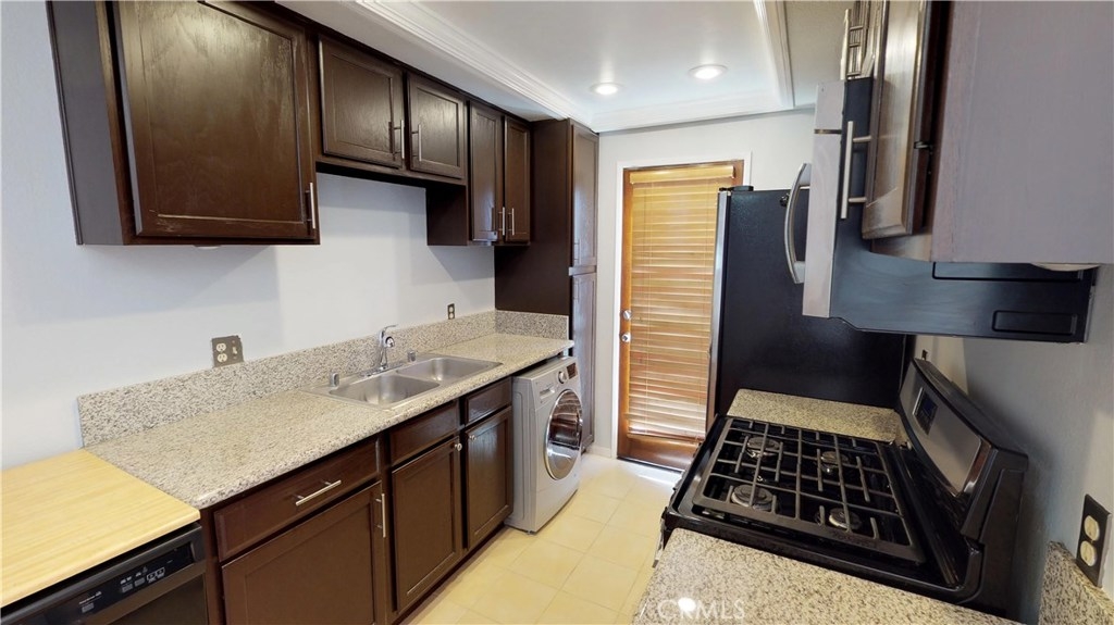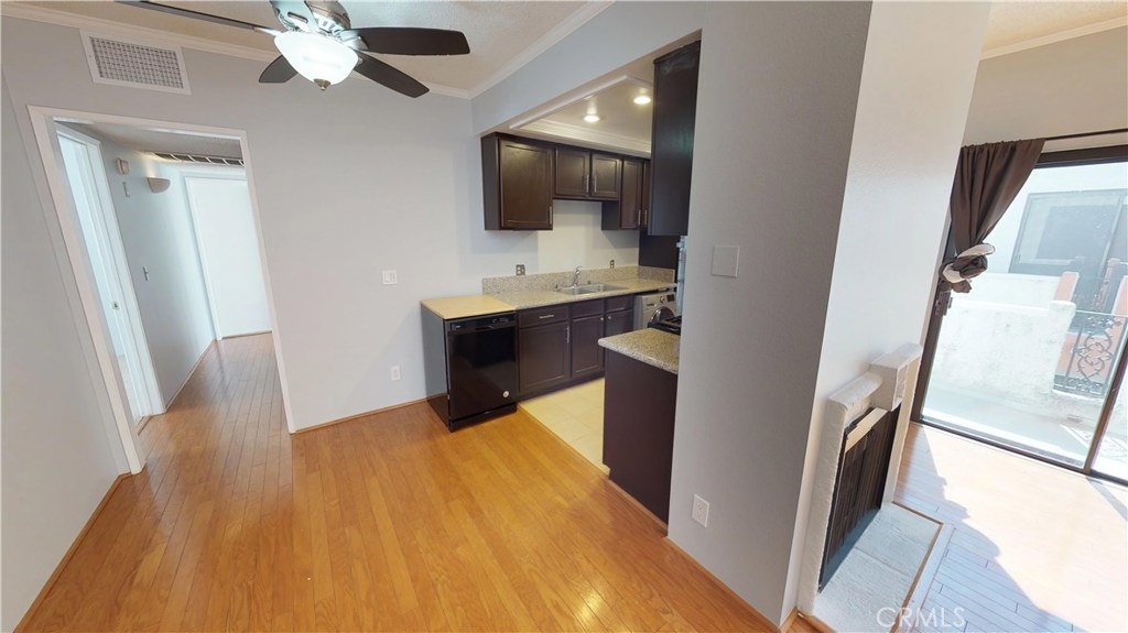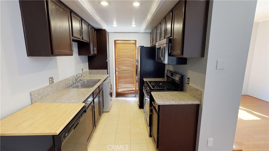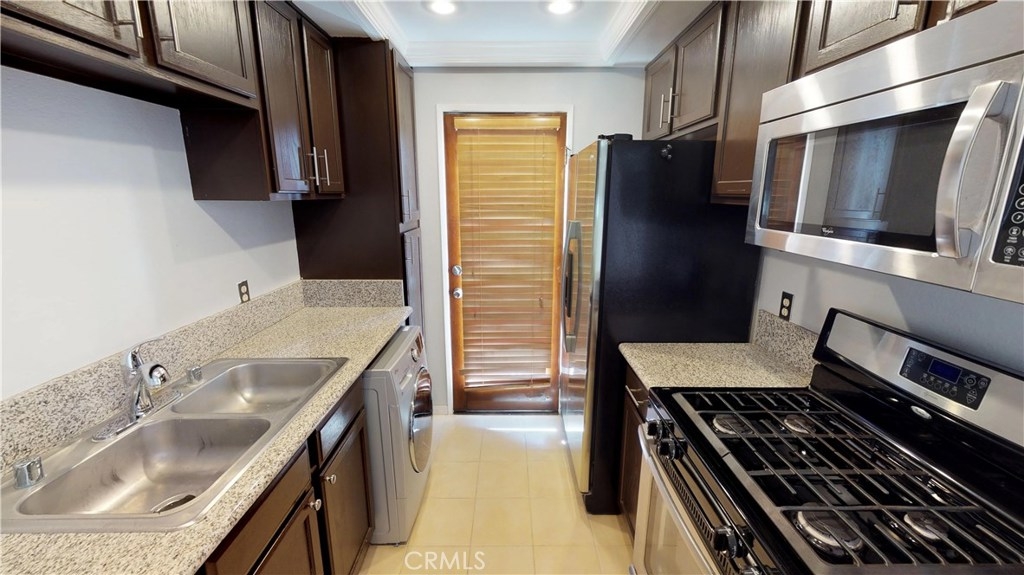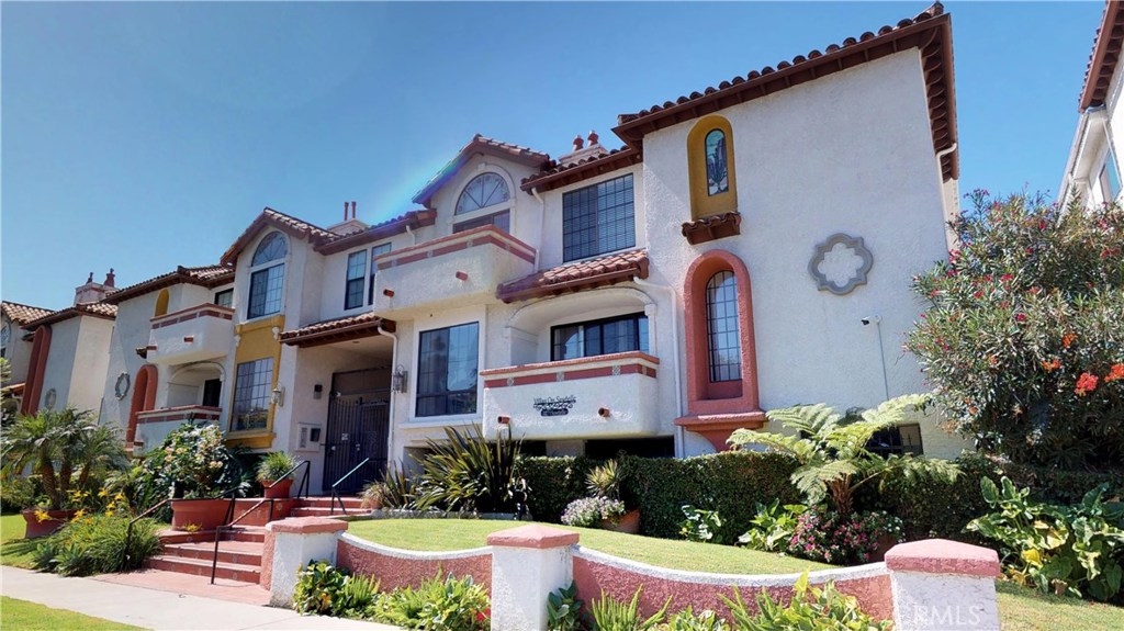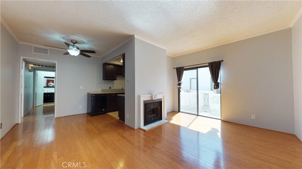 Welcome home! Amazing unit in gated Spanish style building with charming courtyard. Top floor unit is toward rear of building and is flooded with natural light. Front door opens up to a spacious living room w/ fireplace and sliders to patio. This condo features 2 bedrooms & 2 bathrooms, open floor plan large living area with fireplace, kitchen with granite counters & stainless appliances, washer/dryer unit in kitchen, dishwasher, hardwood floors, huge patio with access from kitchen, living room and bedroom. Good sized bedrooms with ceiling fans, great closet space with updated closet shelving, hallway with extra built-in storage and space for linens, gated tandem 2 car parking with space for storage in front of cars. Building has new security cameras. Community laundry room in garage however unit does have a washer/dryer combo unit. Ideal floor plan for roommate situation- current owner used 2nd br as den/ office. One bedroom has en-suite bathroom. Other bathroom is off hallway. New ac/heater installed in 2017. New washer/dryer unit installed summer 2017. New dishwasher installed summer 2017. New ceilings fans hard wired in both bedrooms. Good central location. Less than 1.5 miles from trendy Japanese Row on Sawtelle bustling with hip restaurants.