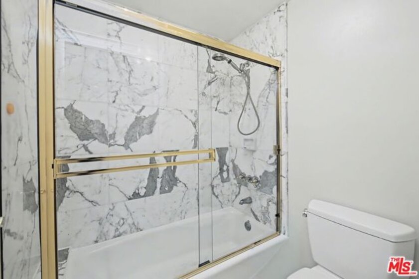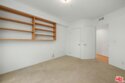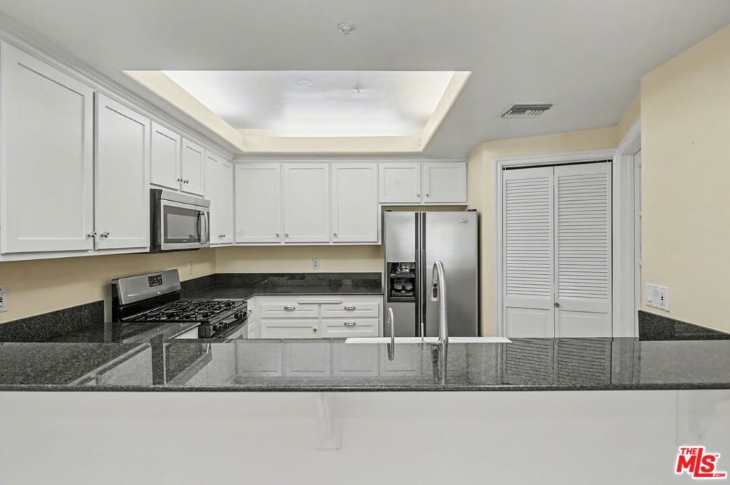Wonderful top level condo in an ideal Beverly Hills adjacent location. This 2 br 2 bath unit faces the neighborhood to the rear and feels so private that it's easy to forget you are in such a central location. The spacious living room with fireplace and wet bar has refinished bamboo floors and French doors that open to a lovely balcony with views of treetops, and beyond to the Hollywood Hills. The kitchen features white wood cabinets, granite countertops, stainless steel appliances and is well laid out with plenty of storage and prep space, and an open bar to the dining area. The laundry is stacked in a closet located within the kitchen. A hallway leads to the private spaces, creating good separation and privacy. The primary suite includes a fireplace, balcony, and custom closet, plus an ensuite bath with a jetted deep tub and elegant marble tile. The second bedroom has the same lovely green views to the north and a generous closet. The unit comes with 2 parking spaces, and building has a fitness room and meeting room, in a fabulous location, just steps away from eateries, shops and houses of worship.