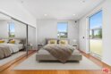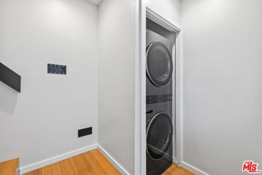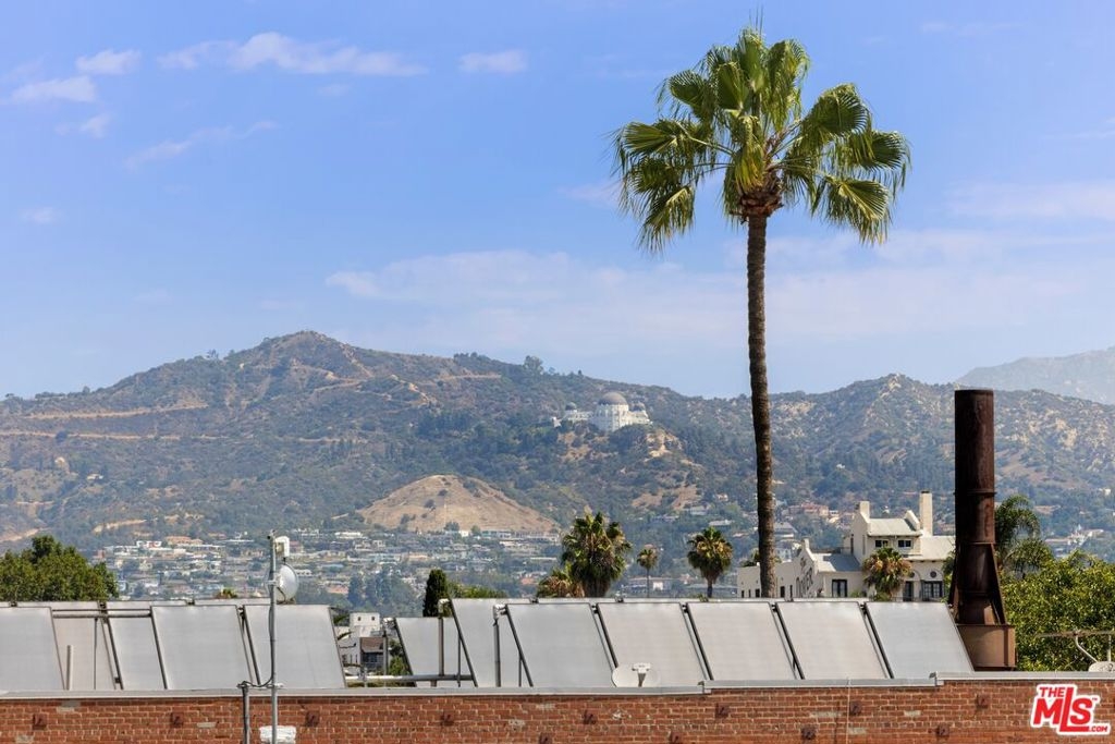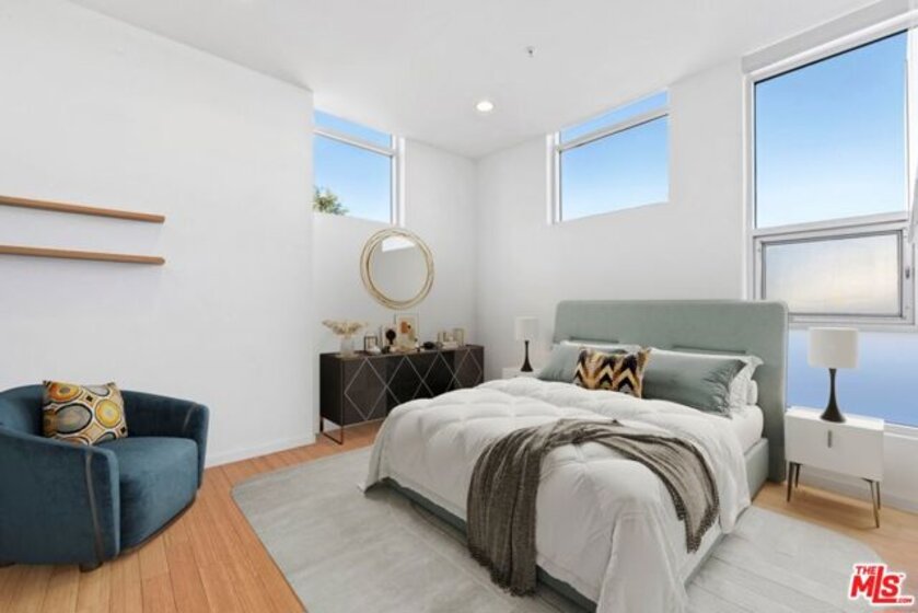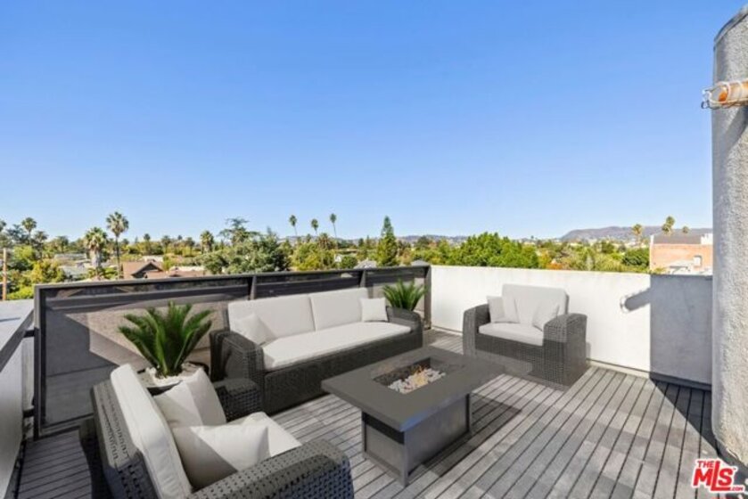 This 1,240 sq.ft. front unit at Gramercy Row in Hancock Park offers privacy, natural light, and thoughtful modern design by AIA-awarded firm Assembledge+. The layout includes an open ground floor with high ceilings, polished concrete floors, smart blinds, smoked glass details, living and dining areas, kitchen with Caesarstone counters and backsplash, LED lighting, updated stainless steel appliances, and a powder room. The second level features bamboo floors, a flexible-use room, full bath, in-unit LG washer/dryer, and storage. The top-floor primary suite includes more bamboo floors, a custom closet, smart blinds, and a skylit bathroom with double sinks, floating vanity, under-cabinet lighting, and a smoked glass divider. A spiral staircase leads to a private rooftop deck with unobstructed 360-degree views from Downtown to the Hollywood Sign. Additional features include a Nest thermostat, Hue smart lighting, Nest smoke detectors, and frosted glass for added privacy. Two tandem parking spaces, guest parking, and elevator access complete the offering. Located near Larchmont Village with easy access to Hollywood and Downtown.