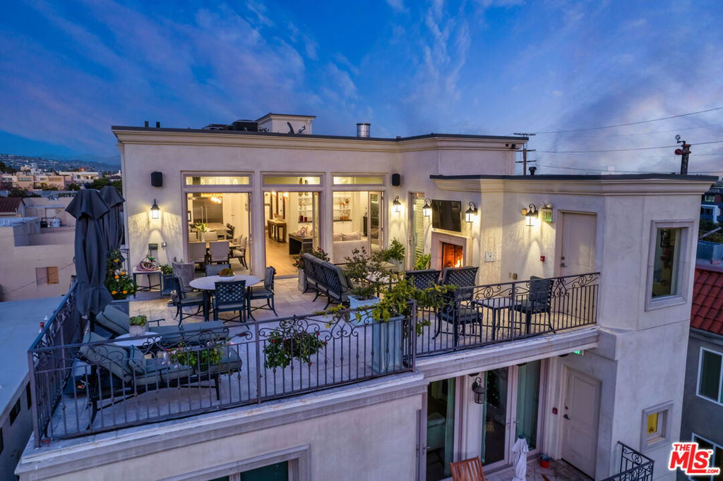 Step into the unparalleled luxury of this sun-drenched, one of a kind, Westwood penthouse, offering an expansive, almost 3,000 SQFT of sophisticated indoor-outdoor combined living space taking up the entire top floor! This 3-bedroom, 3.5-bathroom condo seamlessly blends timeless elegance with modern functionality, catering to the most discerning of clientele. The grand front balcony, with its breathtaking landscape views, features an outdoor fireplace with ample seating, creating the perfect setting for dining al fresco, intimate gatherings, or lavish daytime/evening entertaining. Rich wood floors flow throughout the home, complemented by exquisite crown molding that adds an air of refinement to every room. A private elevator opens directly into a thoughtfully designed open floor plan, where a sumptuous living room, complete with a second fireplace, full bar, and adjacent office space, serves as the heart of the residence. The chef's kitchen is a masterpiece, complete with high end Thermador appliances, Italian stone countertops, and custom cabinetry. The magnificent primary suite is a true retreat, boasting an expansive walk-in closet with bespoke his and her wardrobe space, a spa-like bath with rain shower and freestanding soaking tub, fireplace, and an additional private balcony offering city and hillside views, allowing natural light to flood the room and further enhance its serene atmosphere. Each of the secondary bedrooms feature well-appointed closets and ensuite bathrooms with gorgeous stone finishes. Other amenities include a separate powder room for guests, central air and heat, convenient in-unit laundry, ample storage within the unit, a private storage room in the garage, 2 side by side parking spaces, and video intercom system. Centrally located in the heart of Westwood, just north of Santa Monica Blvd. and South of Wilshire, this home offers convenient proximity to UCLA/Westwood Village, Westfield Century City mall, an array of fantastic dining options, quaint coffee shops, and easy access to nearby freeways. A truly rare opportunity to immerse yourself in the finest penthouse living experience, in this modern and meticulously designed, nine unit intimate complex.