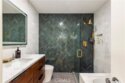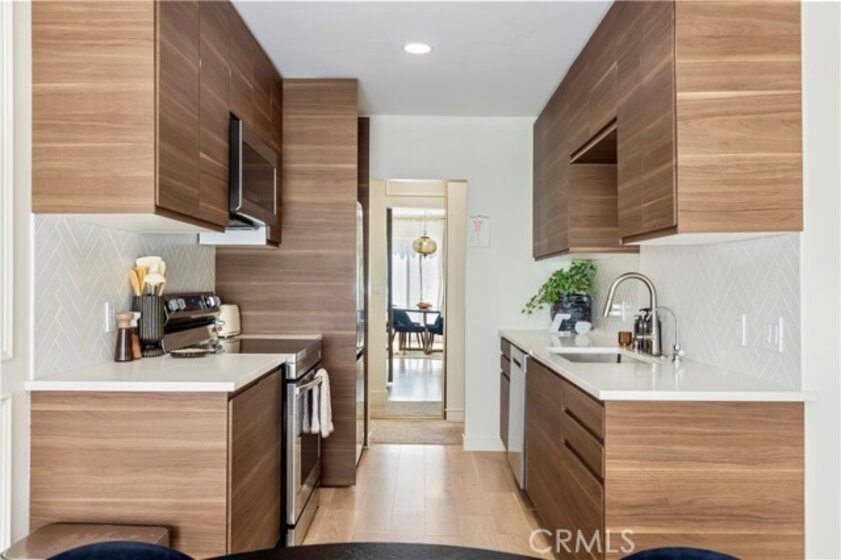 This beautifully reimagined top-floor one-bedroom condo offers 831 square feet of refined living in a prime Hollywood Hills location, just moments from Runyon Canyon and the Sunset Strip. East-facing and filled with natural light, the residence has been thoughtfully updated to blend comfort, design, and high-end finishes throughout. Light-toned oak-style floors, custom millwork, and trimless LED lighting are enhanced by WiFi-enabled Lutron smart switches for seamless ambiance control. The kitchen is both stylish and functional, featuring custom soft-close cabinetry, quartzite counters, handcrafted tile, a Bosch paneled dishwasher, and GE smart appliances—including a range and a refrigerator with built-in ice maker. The sunlit dining area is anchored by elegant drapery and a decorative stone fireplace that adds warmth and architectural interest. The spa-inspired bathroom is appointed with a marble countertop, Moen fixtures, a Kohler soaking tub, and a separate glass-enclosed shower clad in dramatic herringbone tile. The spacious bedroom offers abundant natural light and a walk-in closet, while a large hall closet provides additional storage. The pet-friendly building offers a full suite of amenities, including a gym, sauna, rec room, barbecue area, media lounge, and a fully renovated pool and hot tub coming soon. A new elevator provides access from the secure garage, where two tandem parking spaces are included. Set near the best of Hollywood and West Hollywood, this designer retreat offers turnkey living in one of LA’s most vibrant neighborhoods.