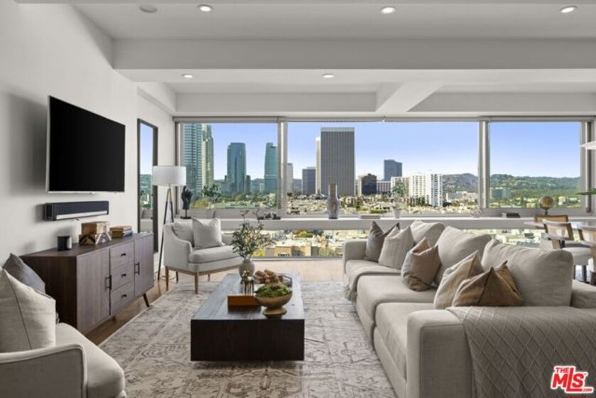 Enjoy sweeping city and mountain views from this north-facing residence in the iconic Century Towers. This 2-bedroom, 2-bath unit is filled with natural light and features hardwood floors, recessed lighting, and refined design touches throughout. The kitchen offers sleek cabinetry and stainless steel appliances, opening to a dining area, expansive living room, and a separate sitting area with tailored built-ins and a beverage refrigerator, perfect for entertaining or relaxing. The primary suite includes dual closets and a bathroom with a modern aesthetic and additional built-in storage, while the guest bedroom and spacious secondary bath provide generous storage as well. Designed by world-renowned architect I. M. Pei, Century Towers is a full-service community offering 24-hour security, gated and guarded entry, doormen, valet parking, tennis courts, fitness center, sauna, outdoor pool, sundeck, and beautifully landscaped grounds.