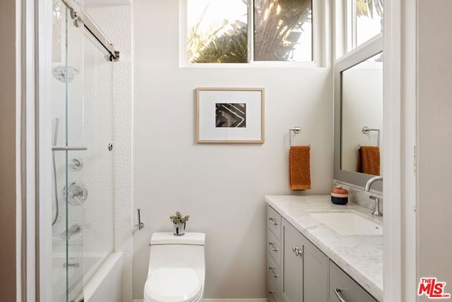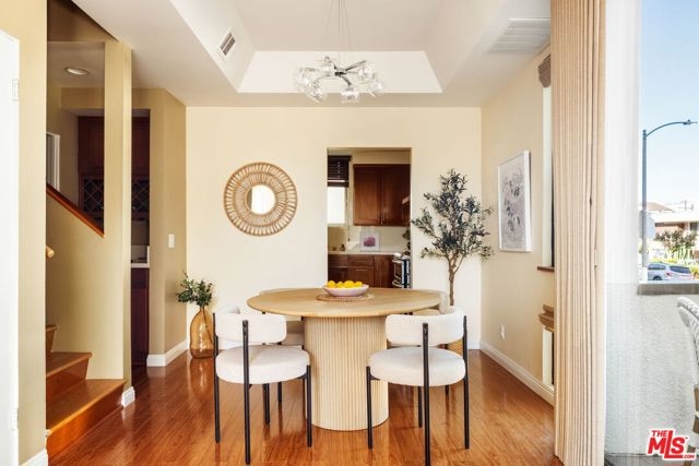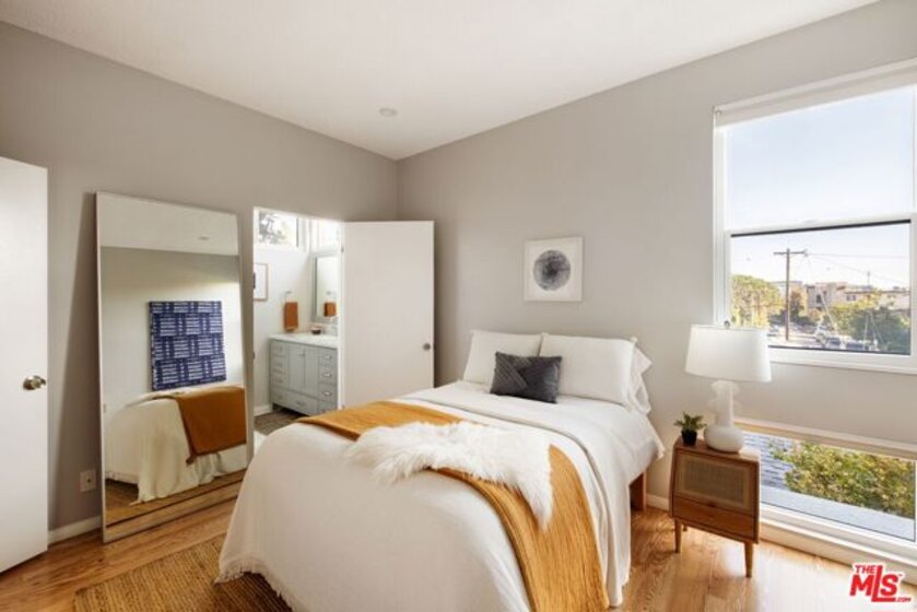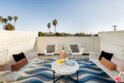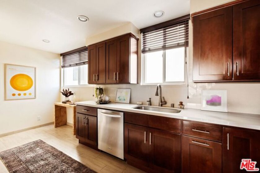 Tucked away in the highly sought-after Palms neighborhood, this beautifully updated tri-level townhouse offers a rare combination of space, style, and privacy. Set at the front of an intimate six-unit building, the residence enjoys unobstructed views, abundant natural light, and the advantage of being elevated above street level for enhanced tranquility. The inviting living room is ideal for both entertaining and everyday relaxation, featuring multiple seating areas, a cozy gas fireplace, and expansive windows adorned with Hunter Douglas treatments that frame lush, green views. Two sets of sliding glass doors open to a wraparound porch, creating a seamless indoor-outdoor living experience. The thoughtfully updated kitchen is a chef's delight, showcasing solid wood cabinetry with ample storage, quartz countertops, and stainless-steel appliances. Adjacent to the kitchen, a dining area, dry bar, and convenient powder room enhance the home's functionality and flow. Upstairs, you'll find two spacious bedrooms, each with a recently renovated en-suite bathroom. The huge primary suite boasts soaring two-story ceilings, large windows flooding the room with natural light, and custom Elfa closet system. The beautifully renovated primary bathroom features a custom vanity with quartz countertop, an oversized trough sink, built-in hamper, linen cabinet, Calcutta tile, elegant gold Kohler fixtures, a rain shower with bench seating, and Starfire glass doors. The secondary en-suite is equally refined, offering a stylishly remodeled bathroom with Brizo fixtures and a tub/shower combination with sleek glass doors. The top level has a large private rooftop deck perfect retreat for entertaining or unwinding while enjoying sweeping views of mountains, palm trees, and the surrounding hills. Whether grilling, lounging, or watching the sunset, this space captures the essence of Southern California living. Additional highlights include a dedicated laundry area, extra storage, recessed lighting, Kasa smart light switches, a Nest thermostat, and energy-efficient Simonton windows throughout. Centrally located just blocks from acclaimed dining destinations such as N/Naka and Pizzeria Sei, as well as downtown Culver City, The Platform, art galleries, and Sony Pictures Studios. The home includes two parking spaces, guest parking, and additional storage in the gated underground garage. With the Expo Line nearby, you'll enjoy convenient access to the best of Los Angeles, often without needing your car.