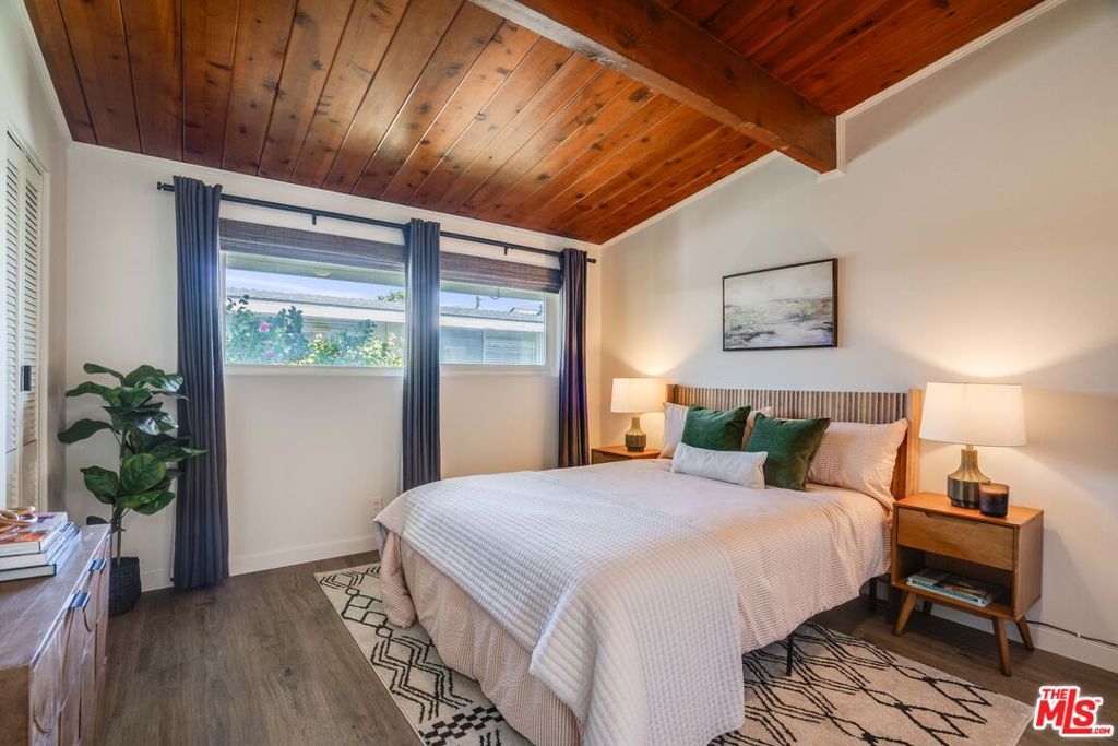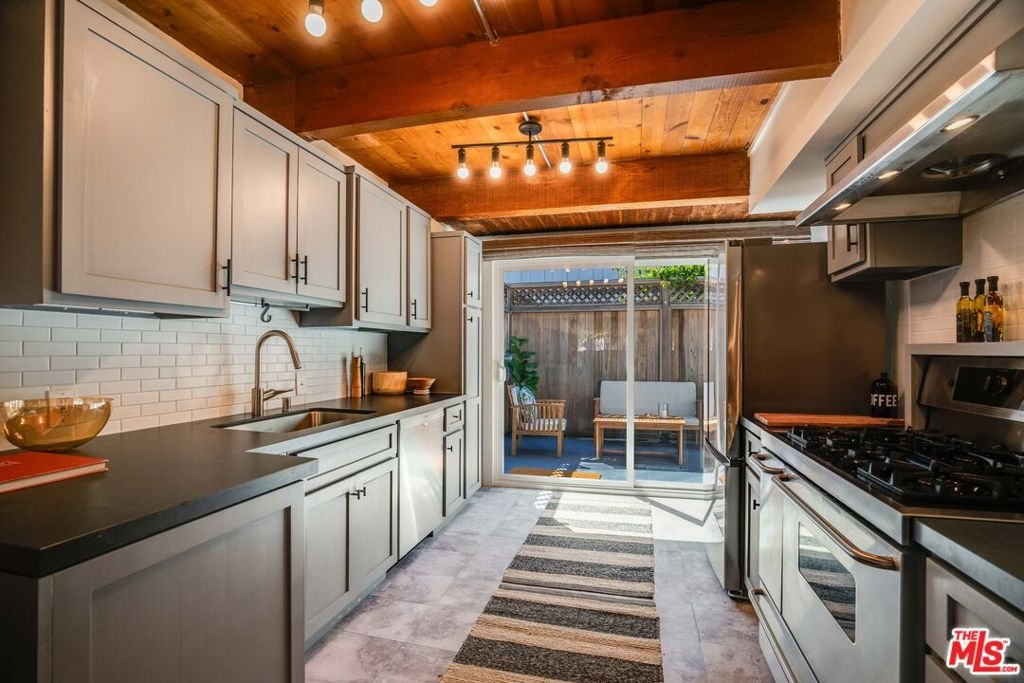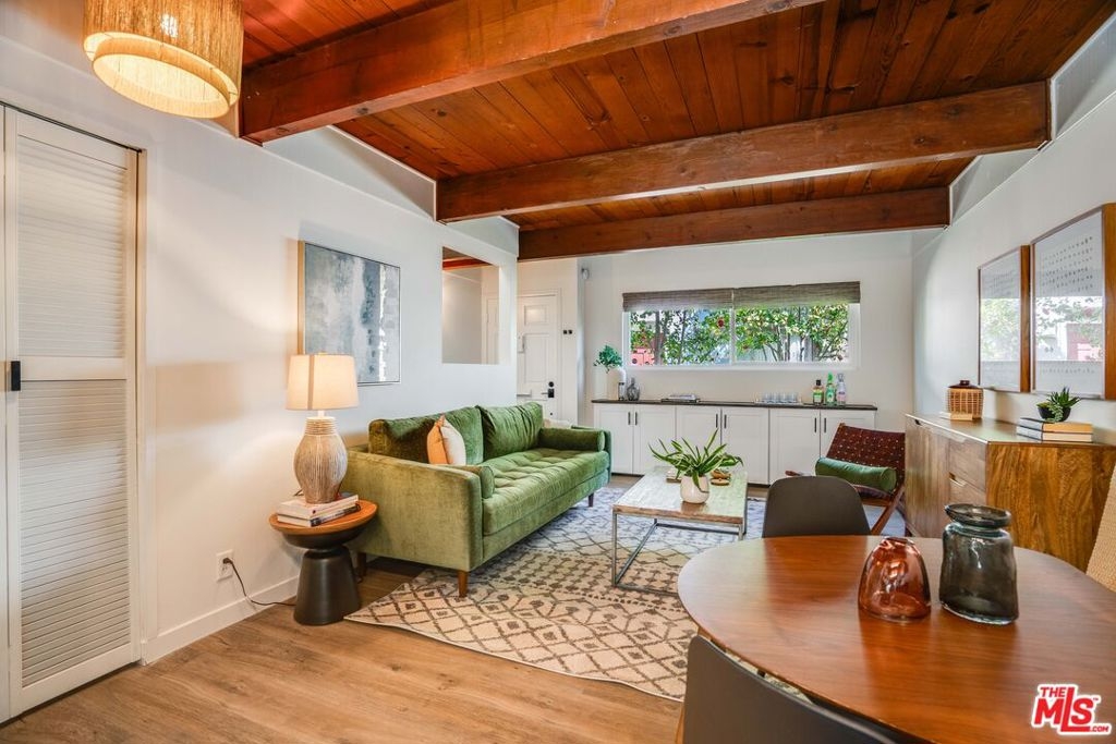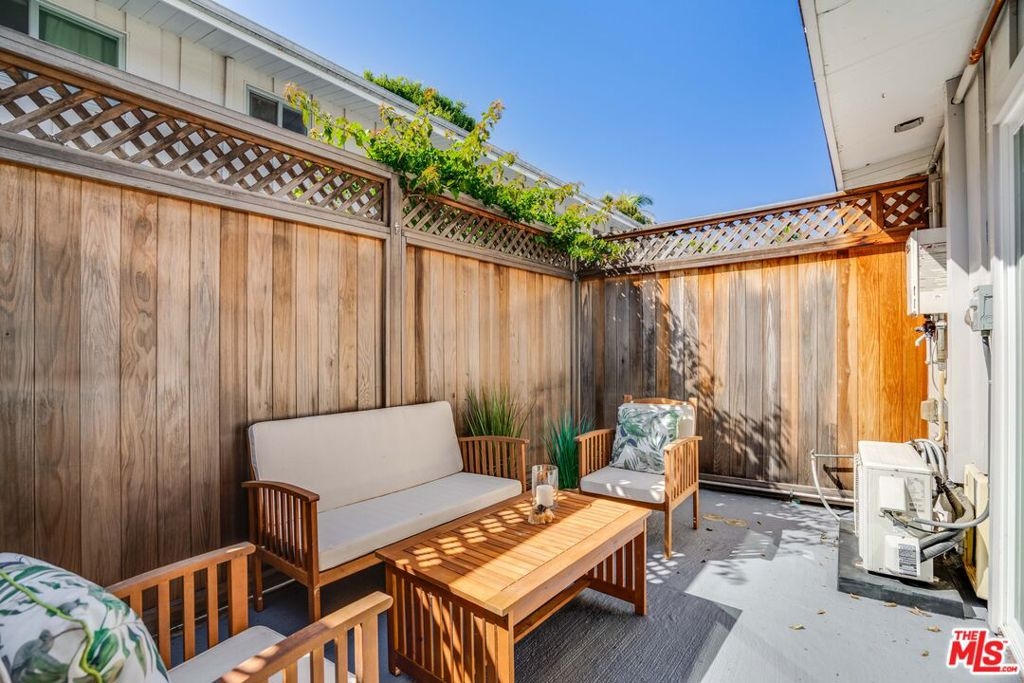 Welcome to this clean, remodeled, and gated townhouse in central Mar Vista. Step inside and you'll immediately notice the beautiful wood beamed ceilings and laminate flooring throughout, drawing you to the open concept Living/Kitchen/Patio. Updated kitchen with quartz countertops, updated lighting, and newer appliances (refrigerator, washer/dryer, dishwasher). Large open patio - perfect for relaxing, gardening, and al-fresco dining. There is a stylish half bath, storage shelves, and a stacked laundry area just off the kitchen. Upstairs there are two bedrooms and a full bath. Both bedrooms feature dramatic vaulted wood-lined ceilings with ample closet space in each room. All new within the last 5 years: Vinyl patio sliding door, AC mini split upstairs, Hunter Douglas roller shades, and updated sinks/toilets/vanities in both bathrooms. The lush gated grounds include a sparkling clean community pool and spa. This unit has its own parking spot located not too far from the unit. New roof and skylight in 2019. Close to the beach, shops, eateries, and everything else the Westside has to offer.