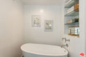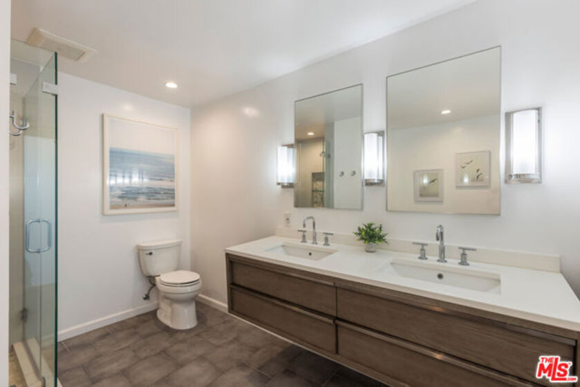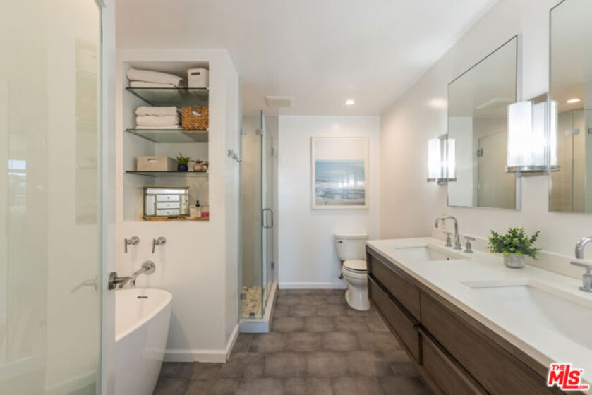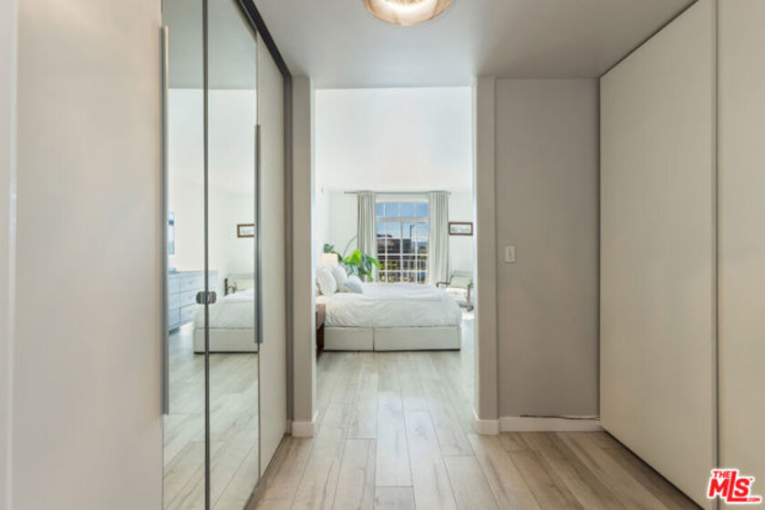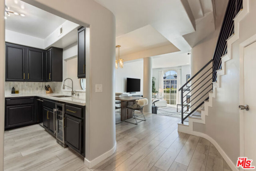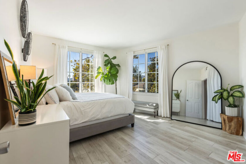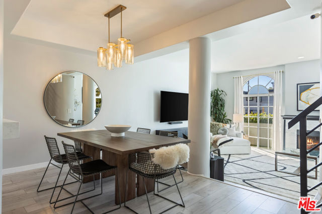 The one you have been waiting for. California casual sophistication defines this highly desired corner residence, showcasing gleaming plank flooring throughout, soaring ceilings, recessed lighting, and an abundance of natural light. Enter through the inviting foyer into the dedicated dining area, highlighted by an impressive tray ceiling and custom light fixture, which flows seamlessly into the expansive main living space. Here, an elegant marble fireplace with wood mantle, convenient wet bar with shelving, and dramatic floor-to-ceiling glass doors open to a collection of intimate balconies perfectly merging indoor and outdoor living. The well-appointed kitchen boasts considerable cabinetry, stainless steel appliances, and a wine refrigerator, while a chic powder room completes the main level. Upstairs, the serene primary suite offers a spacious bedroom, stylish closet, and dazzling ensuite bath with dual vanity, deep soaking tub, and separate shower. A comfortable sunlit second bedroom provides ample storage, while the third bedroom offers flexible potential as an office, den, or guest space. Both are serviced by a sizable hall bathroom with sleek vanity and tub-shower combination. A dedicated laundry room with full-size side-by-side washer and dryer, upper cabinetry, and additional hallway linen storage complete the second level. Perfectly situated near the Miracle Mile, LACMA, The Grove, Century City, Beverly Hills, and more, this residence places renowned dining, shopping, and entertainment right at your doorstep.
