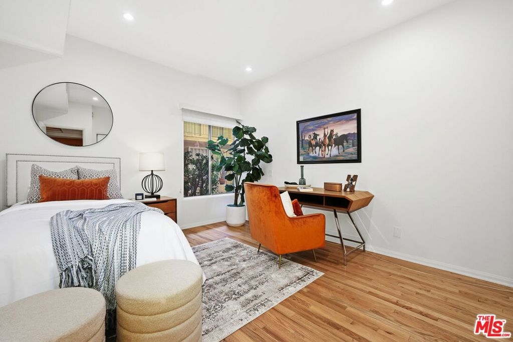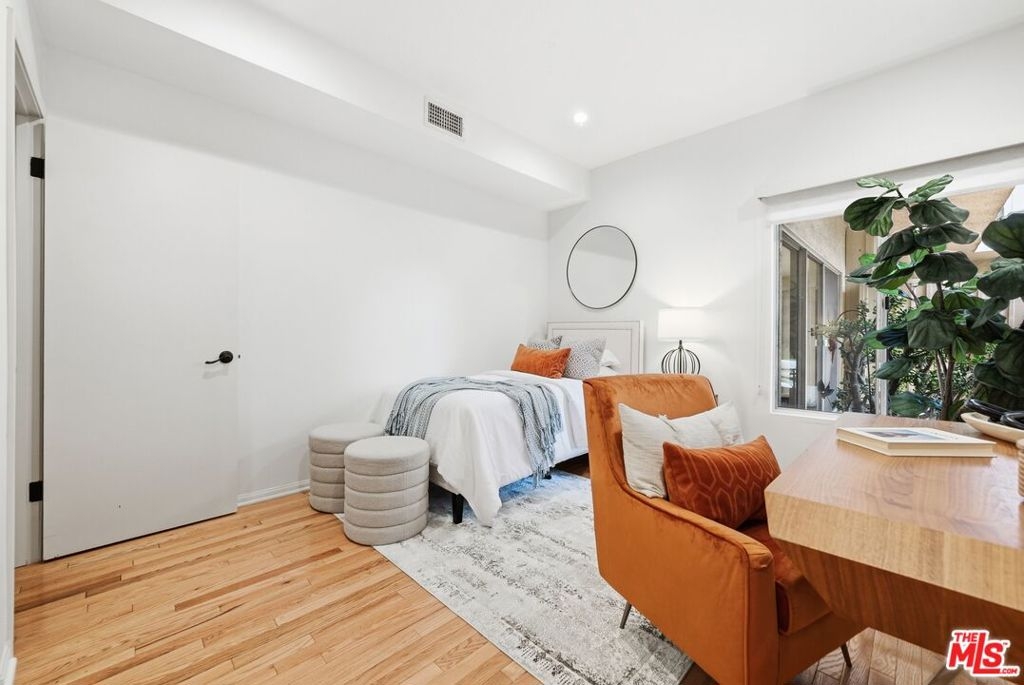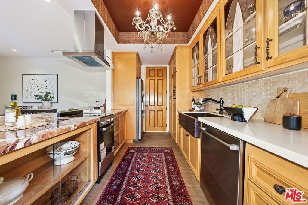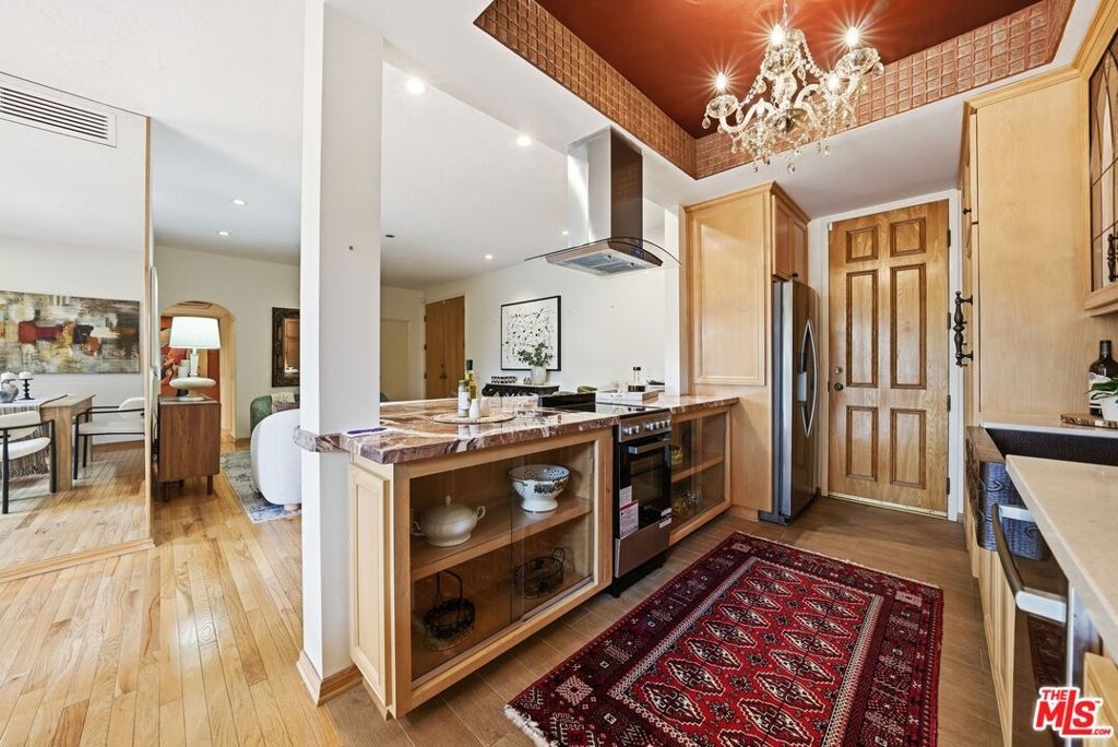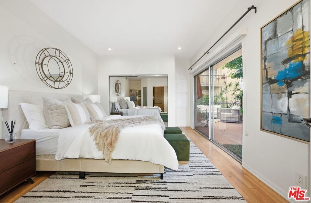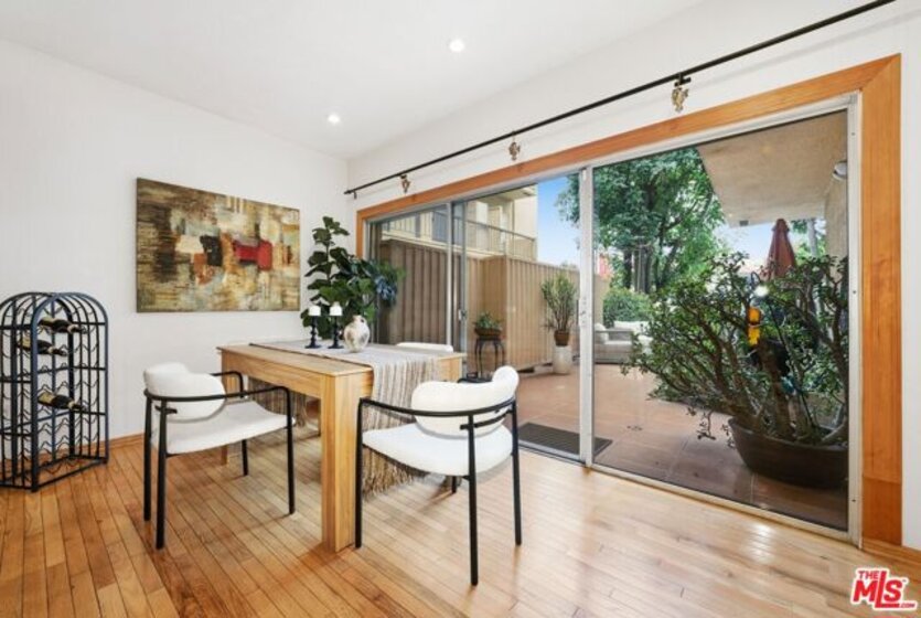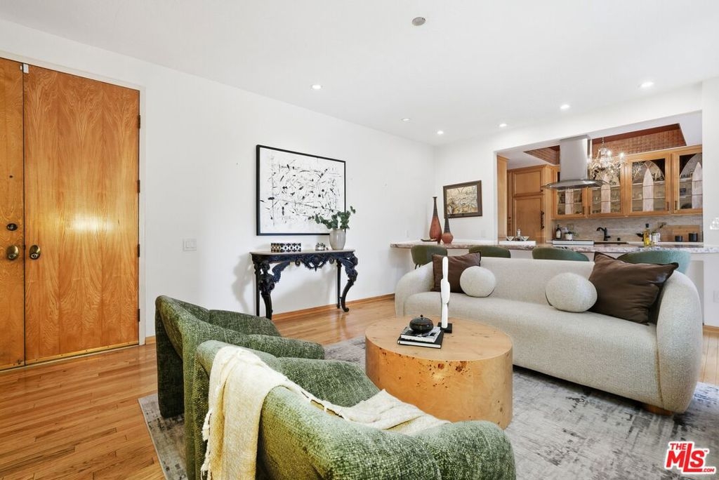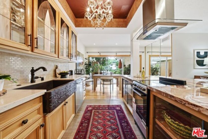 Completely renovated with a keen eye for design and detail, this stunning residence offers a perfect blend of modern sophistication and warm, inviting character, further enhanced by a full wrap-around patio featuring a tranquil water feature that creates a seamless indoor-outdoor living experience. The kitchen and entertaining space serve as the heart of the home, thoughtfully reimagined to balance style and functionality. At its center, a gracefully curved breakfast bar, topped with richly veined stone, creates a striking focal point and an inviting place to gather, whether for casual mornings or lively evenings. The open layout allows for a seamless flow into the living area. The galley-style kitchen is both functional and beautifully appointed, featuring custom wood cabinetry with glass-front uppers that showcase curated pieces and add depth and charm. Above, a statement chandelier set within a richly accented, coffered ceiling introduces a layer of sophistication and architectural interest rarely found in condo living. Outfitted with sleek stainless steel appliances, a contemporary vent hood, and an integrated cooktop, the kitchen is designed for both performance and style. Textured tile backsplashes and warm-toned countertops create a cohesive, layered aesthetic, while a statement sink paired with a bold, sculptural faucet adds a distinctive designer touch. Thoughtful finishes, including built-in display shelving, decorative hardware, and a dedicated wine rack, enhance both form and function. Anchored by warm wood flooring, the space feels polished yet inviting, ideal for both everyday living and elevated entertaining. On the same floor, residents have access to two laundry rooms, with one conveniently located directly across the hall from the unit. Residents enjoy a full suite of amenities, including a pool, spa, newly renovated gym, and a sauna. HOA dues include earthquake insurance, and an on-site maintenance team and superintendent are available five days a week. Ideally located near Brentwood's premier shops, dining, and cafs, this beautifully renovated home offers an exceptional blend of comfort, style, and convenience in one of the Westside's most sought-after neighborhoods.