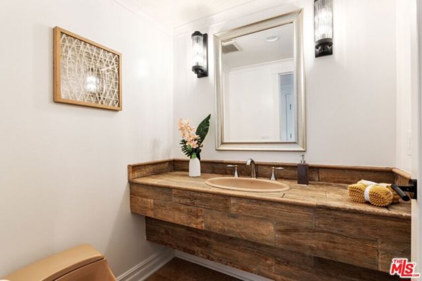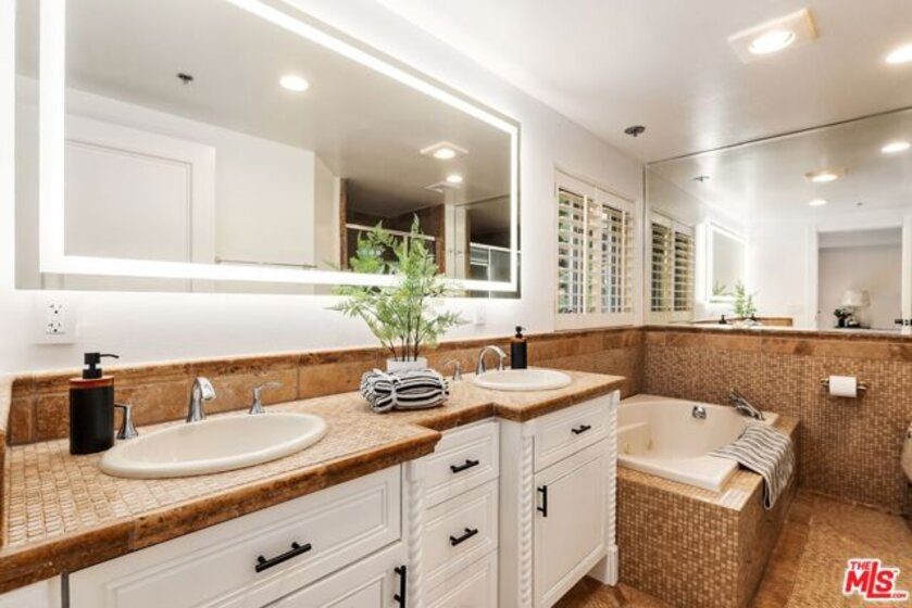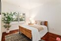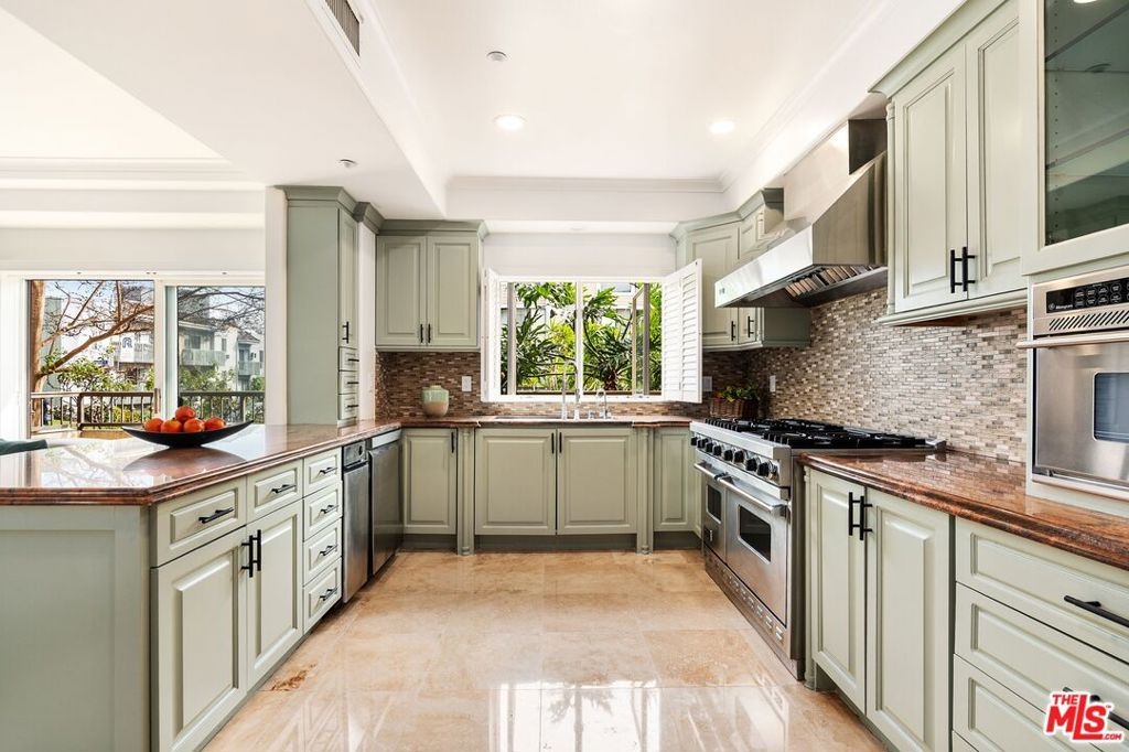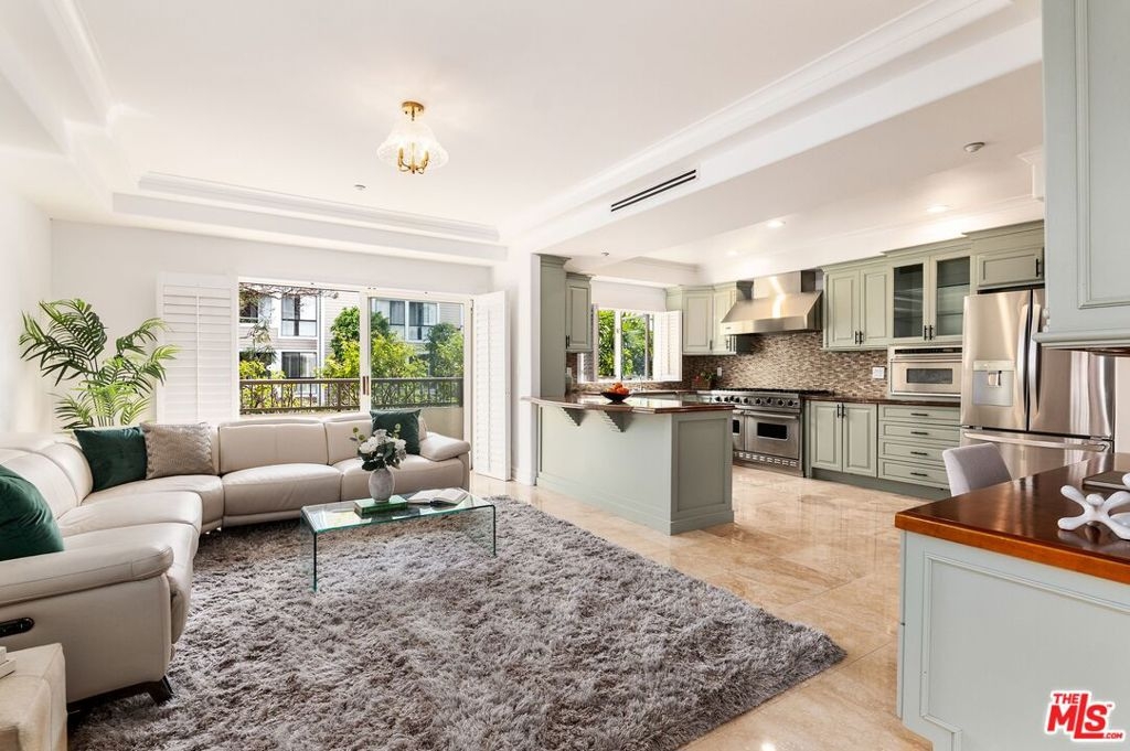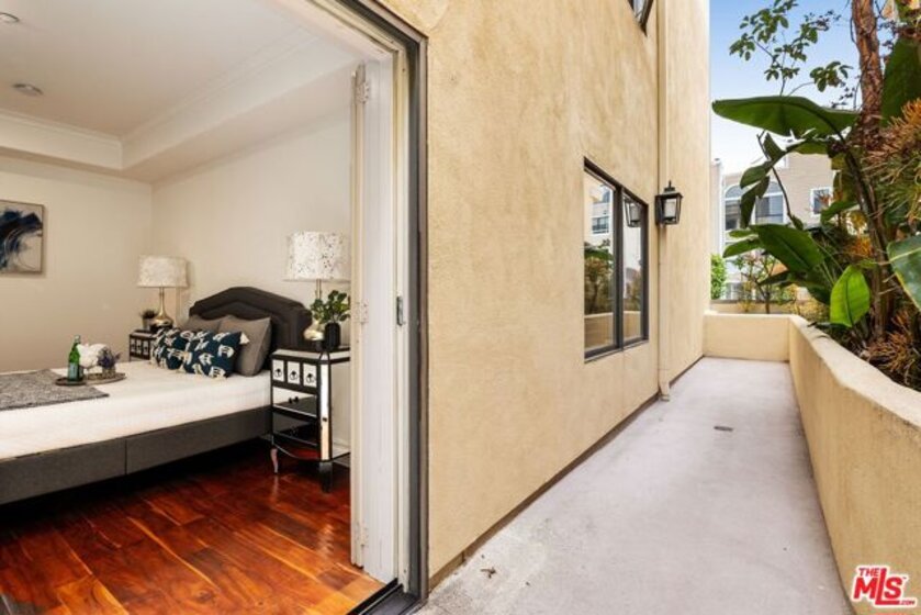 Ideally situated in the heart of Brentwood, just moments from the renowned shops, cafes, and restaurants along San Vicente Boulevard, this exceptional first-floor residence offers a rare combination of privacy, convenience, and indoor-outdoor living. Set within an intimate, secure 8-unit building, the home delivers the ease of condominium living with the comfort and feel of a single-family residence. The 2-bedroom, 2.5-bath home is uniquely distinguished as the only unit in the building with multiple private outdoor spaces. A charming side patio with street views, a front balcony, and an additional side outdoor area create an expansive and versatile setting that is ideal for entertaining, relaxing, or enjoying Brentwood's year-round sunshine. Inside, travertine flooring flows through the main living areas and is complemented by recessed lighting and plantation shutters, creating a refined yet welcoming ambiance. The open-concept living and dining areas offer seamless flow for both everyday living and hosting guests. The well-appointed kitchen features a Viking 6-burner range with double oven and stainless steel appliances, including a refrigerator, dishwasher, and microwave. A thoughtfully placed built-in desk area just across from the kitchen provides a convenient workspace for working from home or managing daily tasks. Both bedrooms are generously sized, with the primary suite offering an en-suite bath. The guest bathroom features a steam shower and sleek LED mirror for a spa-like experience, while a separate powder room adds convenience for guests. Additional highlights include in-unit laundry, secure building access, and two assigned side-by-side parking spaces in gated community parking. With its premier Brentwood location, low HOA fees, and rare private outdoor living, this residence presents a unique opportunity to enjoy West Los Angeles living at its finest, where walkability, comfort, and style come together seamlessly.